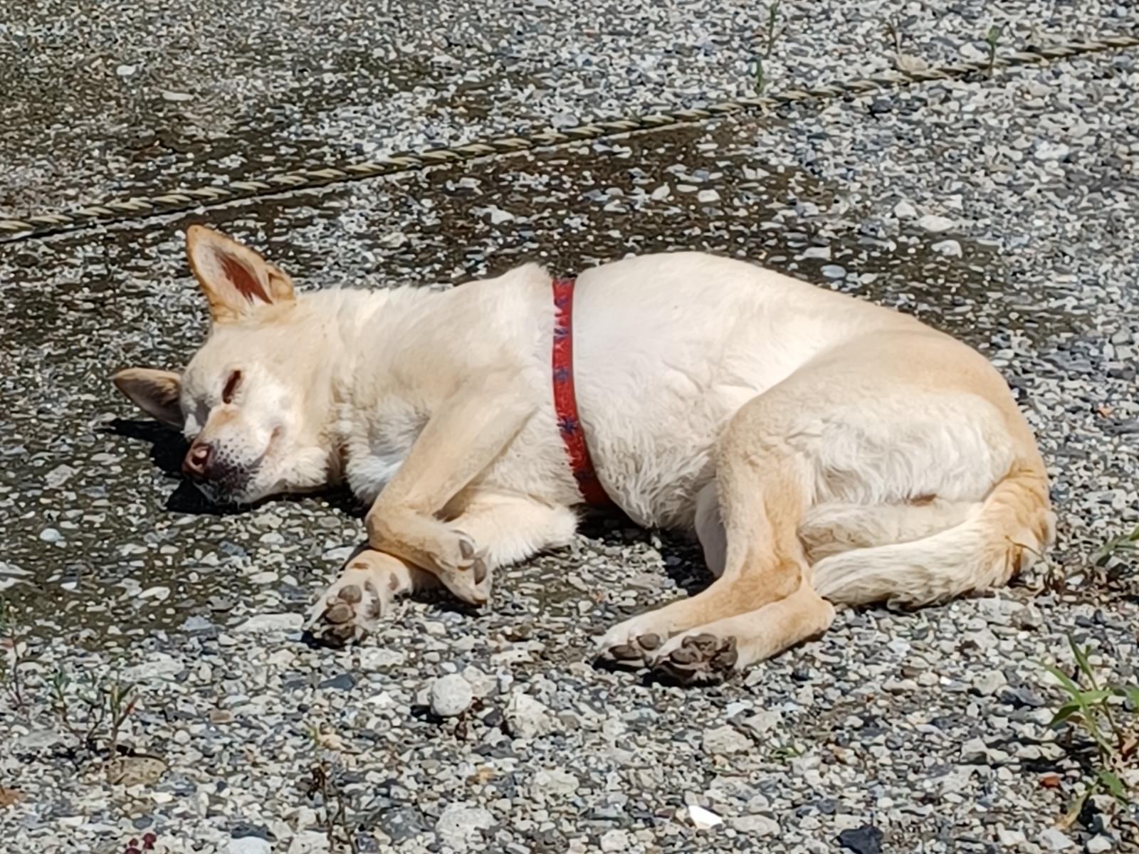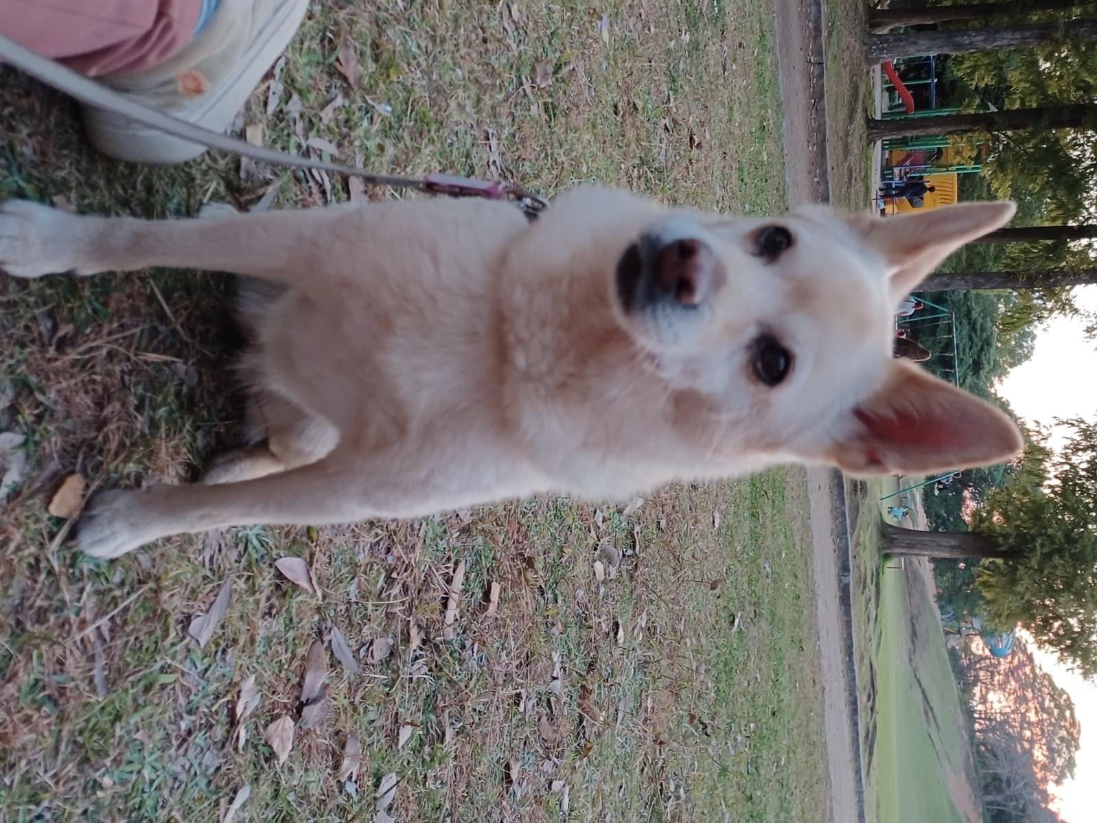 ハーネスの赤に青い十字の模様が入ってるベージュの50cm位の雑種を探しています
