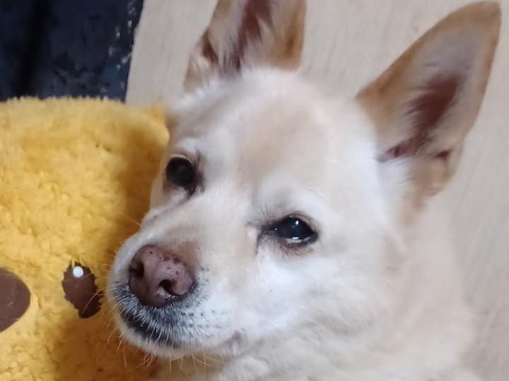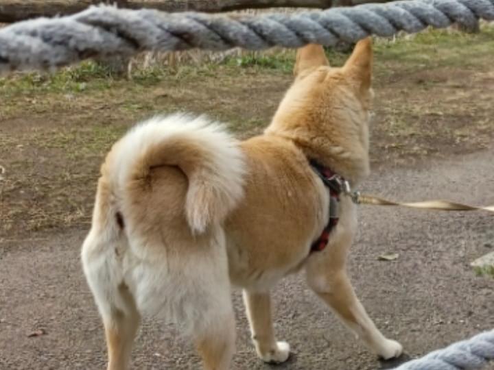 ハーネスの赤に青い十字の模様が入ってます白っぽいベージュの柴犬風のミックスです耳が立っています尻尾は上がって丸まっています 鼻が少しピンクです