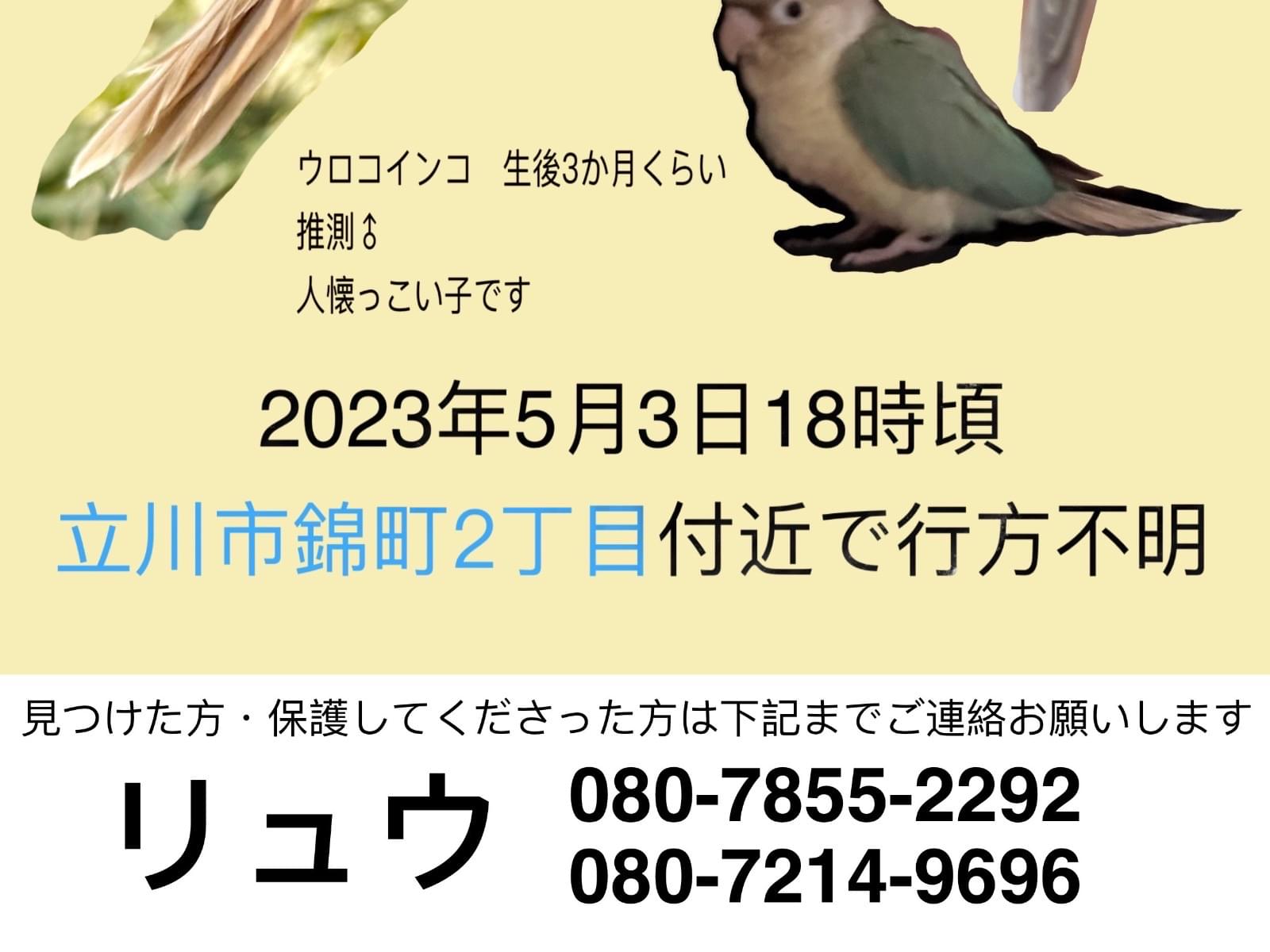 ホーム迷子鳥東京都ブルーパイナップルの…ブルーパイナップルのウロコインコを探しています管理編集するポスター掲載終了最終更新日時:2023/05/04 21:08写真情報用件迷子名前ジッジ性別オス年齢三ヶ月場所東京都 立川市錦町発生日時2023年5月4日(木)飼い主リュウ説明ブルーパイナップルのウロコインコ 人の言葉覚えてません連絡先URL未設定掲示板情報交換のための掲示板です。ユーザーからの情報提供、オーナーからの連絡などにご利用下さいませ。書き込んだ情報は、オーナーのメールに通知されます。まだコメントはありません。トピックを作成する