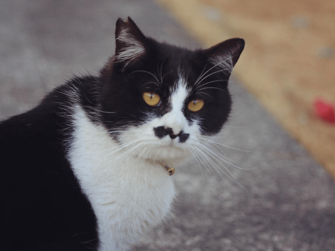 鼻の下に黒くヒゲみたくなっていてピンクのヒョウ柄の首輪してます