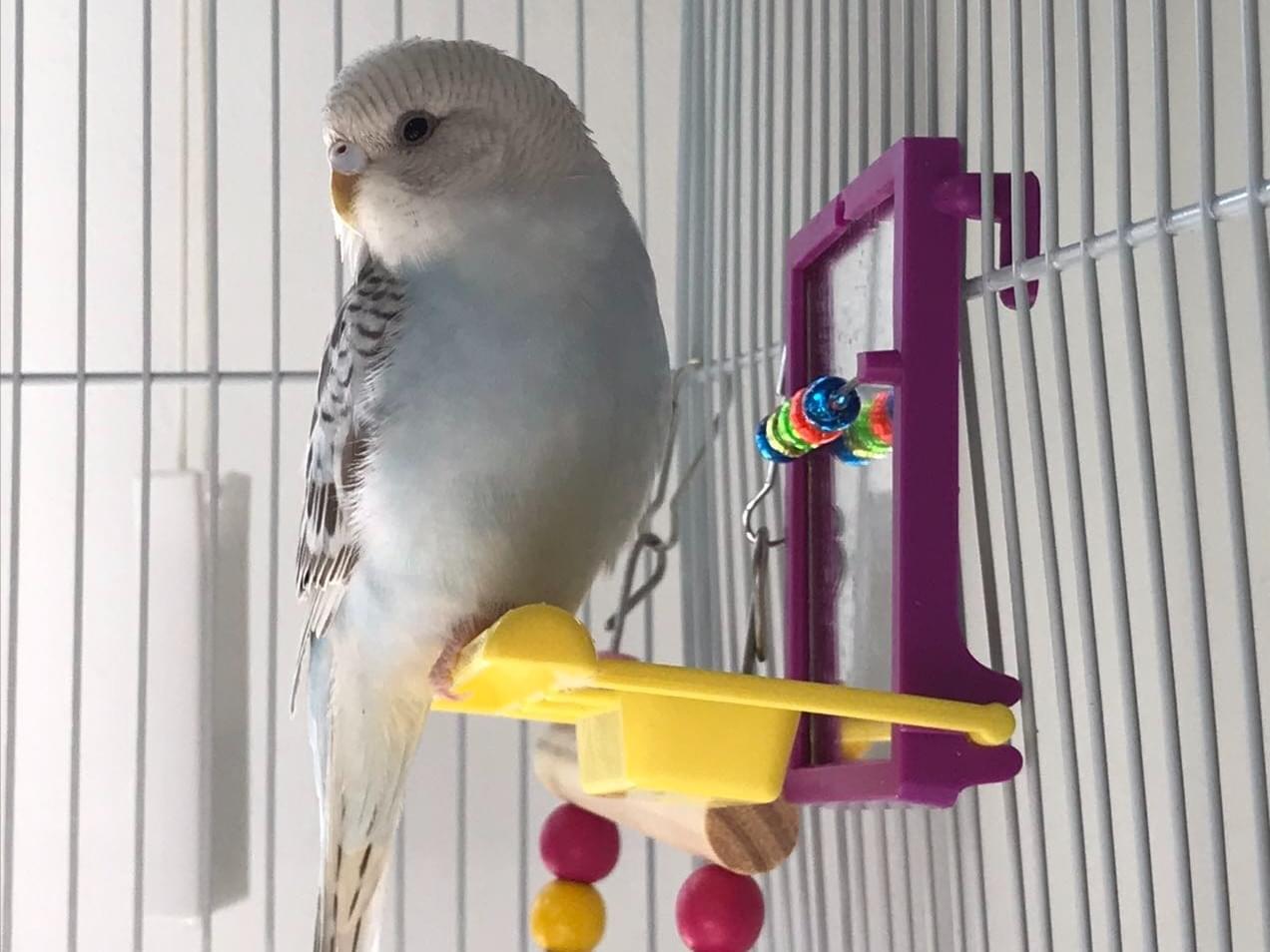 今朝カゴの小窓を動かし、カゴから逃げ出してしまいました。青と白のインコです。