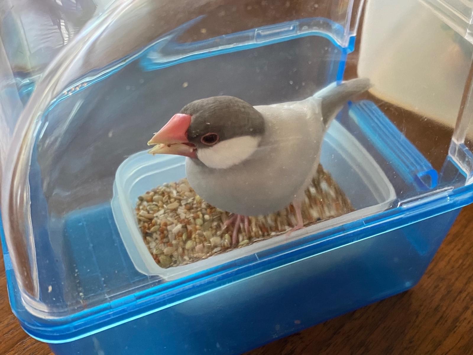 頭は濃いグレー、体は薄いグレー、ほっぺは白い文鳥です。