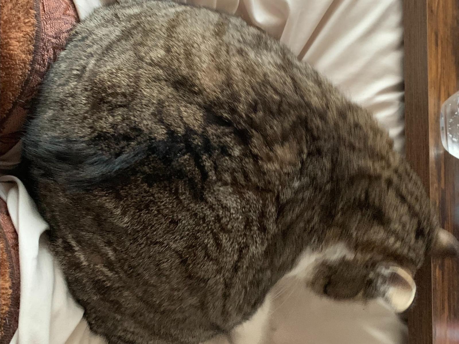 こげ茶トラ 腹が白い 右足付近に白い毛が1cmハート形っぽく生えています