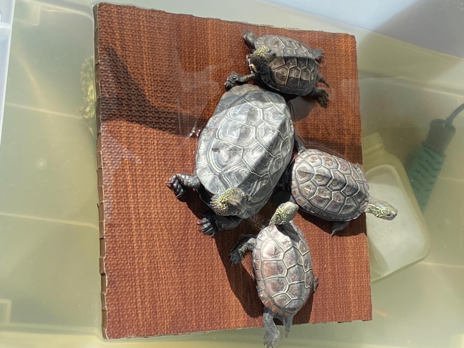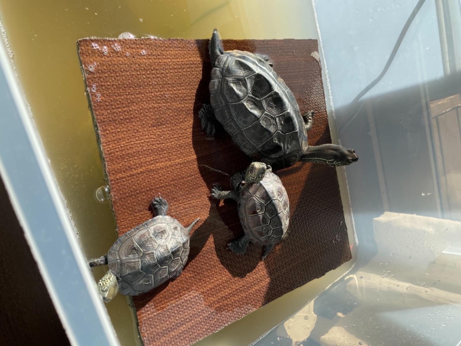 体長は、15cm〜20cmくらいの甲羅は、黒っぽいです。画像に載っている亀は、兄弟です。
