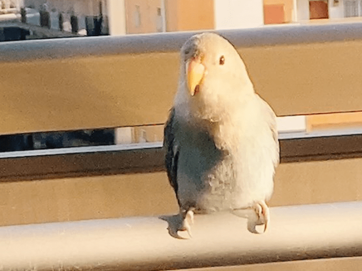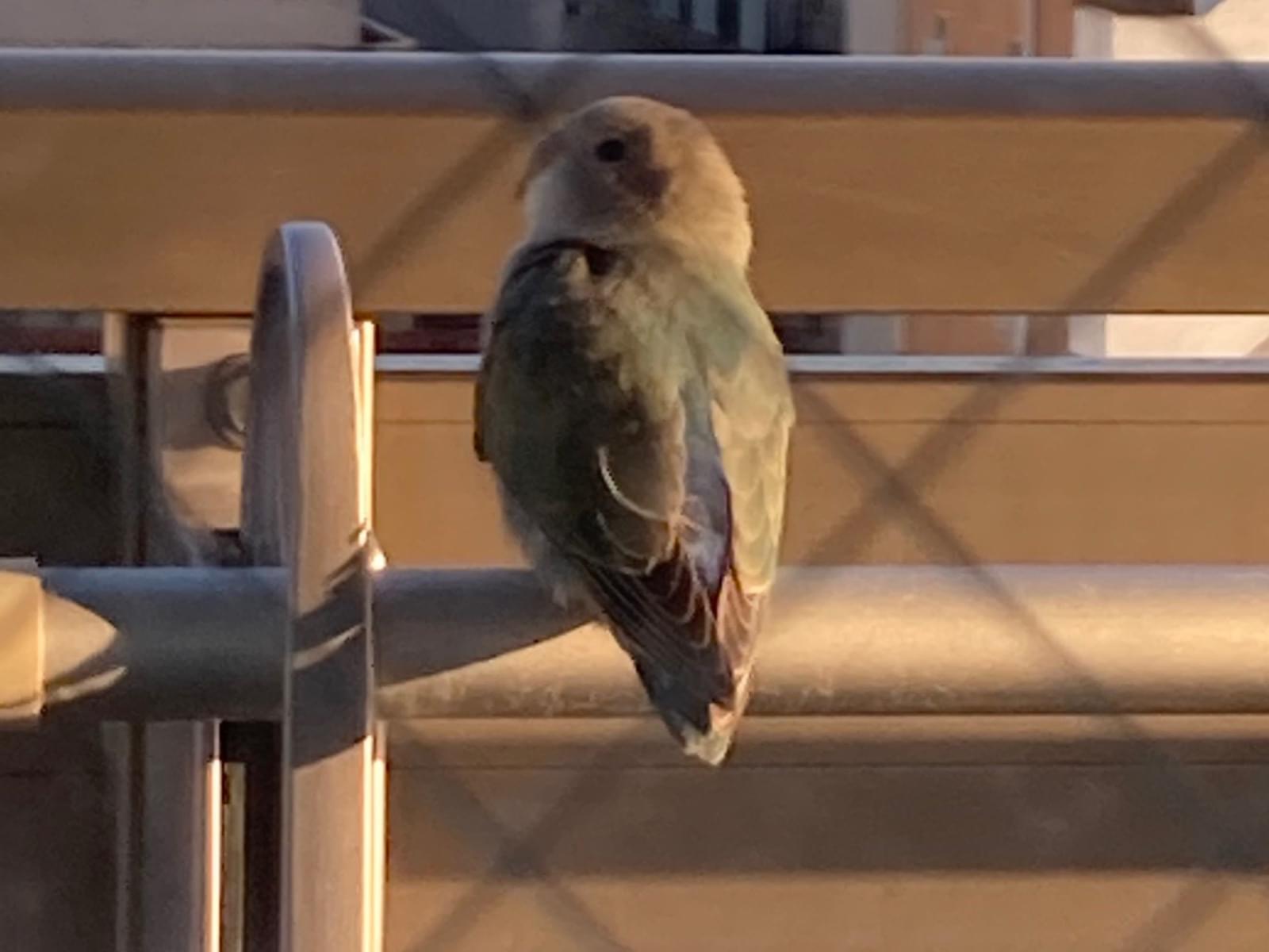 水色のインコがベランダの窓にぶつかってきました。その後1時間ほど同じ場所にいます。