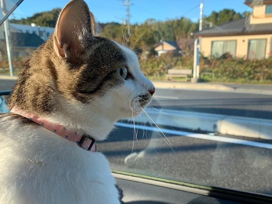 ・赤い鈴付きのピンク生地に緑のドット柄の首輪