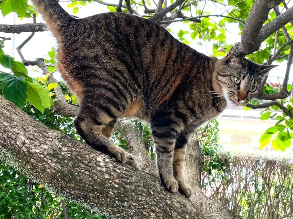 昼間の数時間だけ、外で遊ばせています。木登り、屋根登りが好きです。21日の10時40分頃まで、2番目の写真のように柿の木に登って遊んでいました。この後、姿が見えなくなり、いつもお昼の時間に帰るのが帰らず、そのままずっと帰って来ません。遠くまで行ってしまって、帰り道がわからなくなっているのかも知れません。