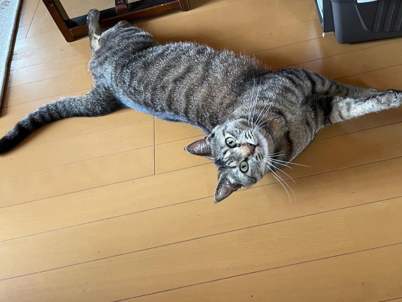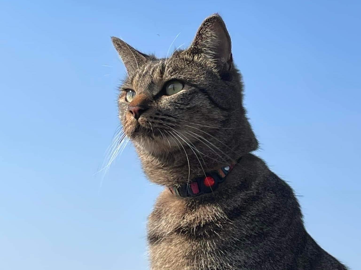尻尾が長くまっすぐ。お腹が茶色のキジトラです。あごの下だけ少し白い。体重はいなくなった時は5㎏くらいの中型です。青い布地に赤い丸のついた首輪(鈴はなし)をしています。知らない人には近づかない慎重な慎重な性格です。