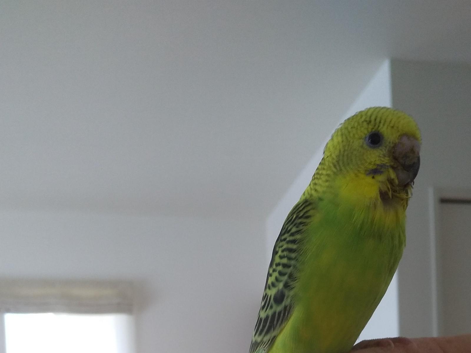 肩に乗せていたところ、玄関のドアの隙間から飛び立ちました。人懐こくで肩に乗るのが好きで、ピヨピヨと高い声で鳴きます。