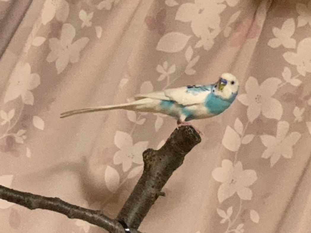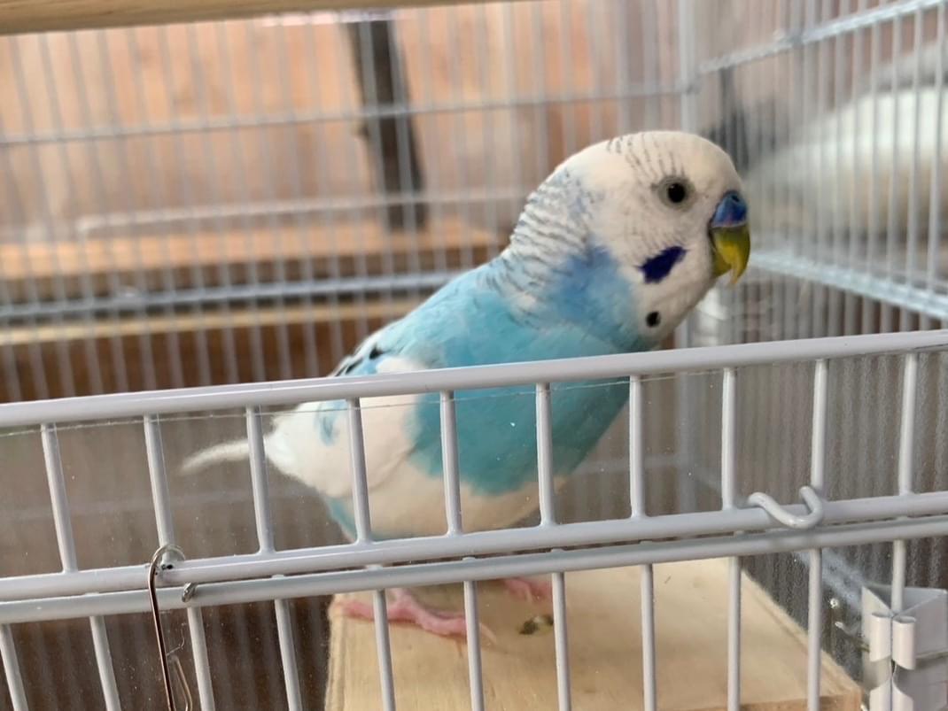 白と水色のセキセイインコです。ハクーと呼ぶとピーと鳴きます