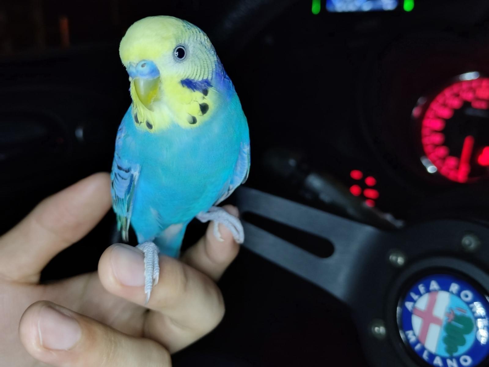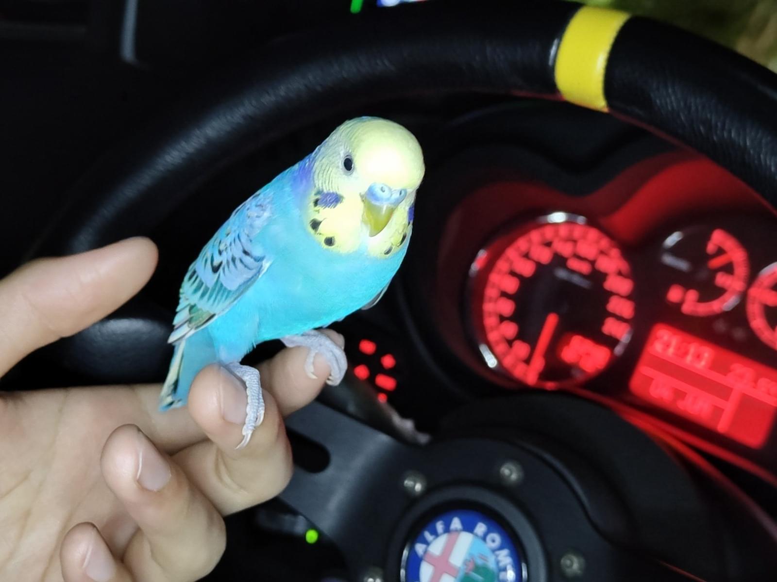頭が黄色、体が青色黒のまだら模様のインコを保護しました