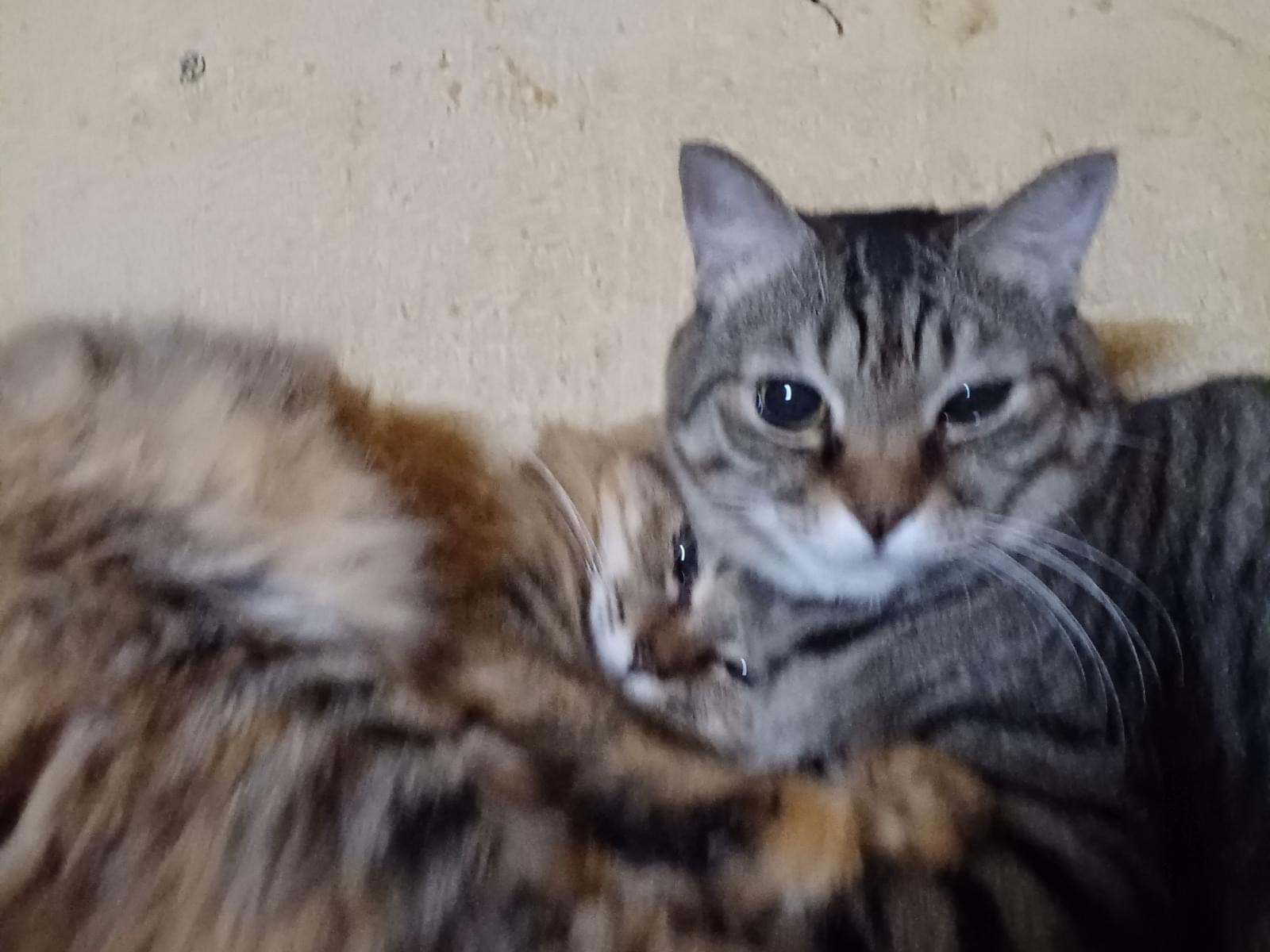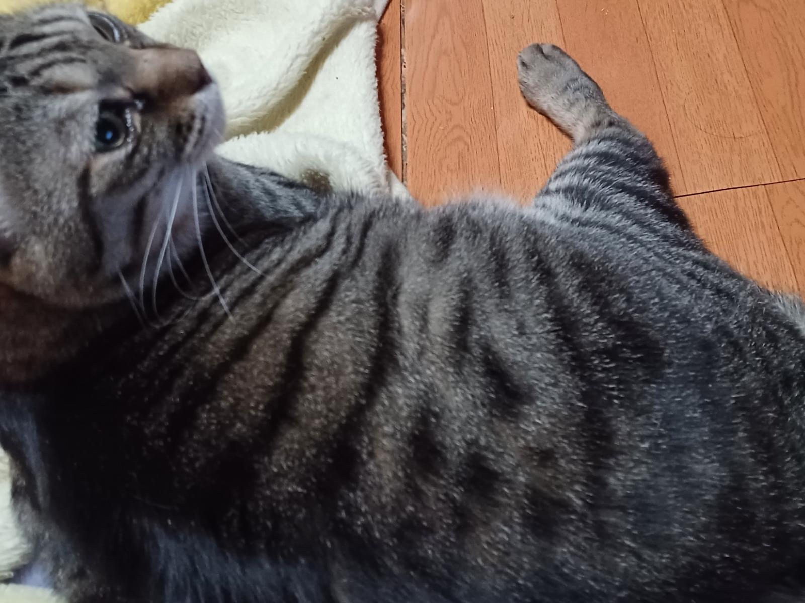 黒いキジトラでしっぽが普通の半分くらいで短いです
