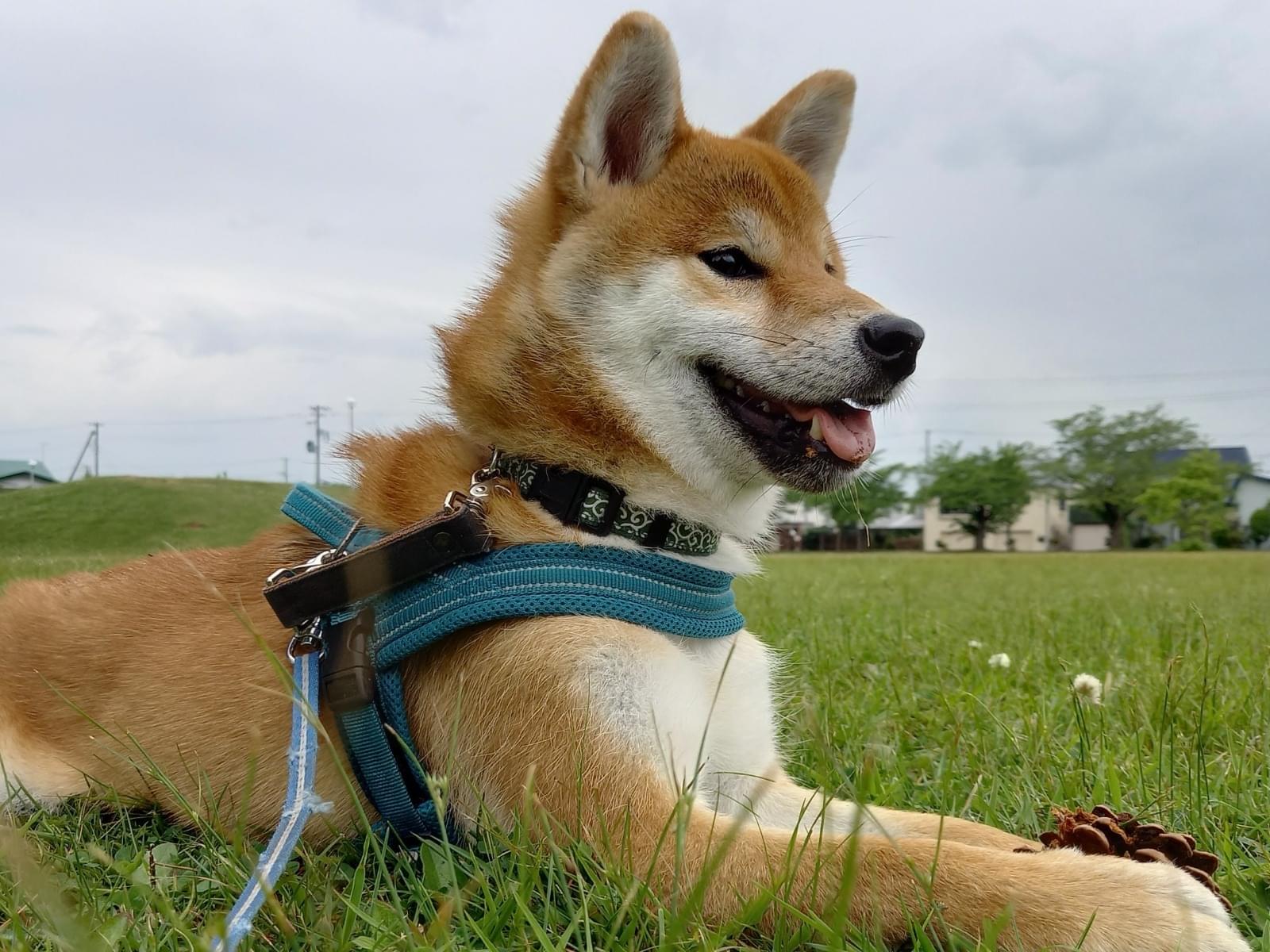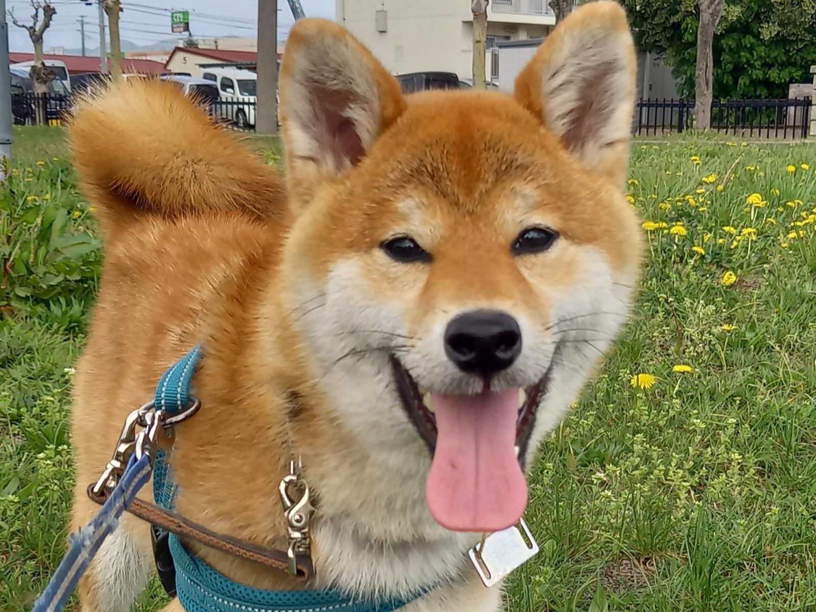 和柄の緑の首輪、ブルーの胴輪、ブルーのリードをつけたまま逃げてしまいました。