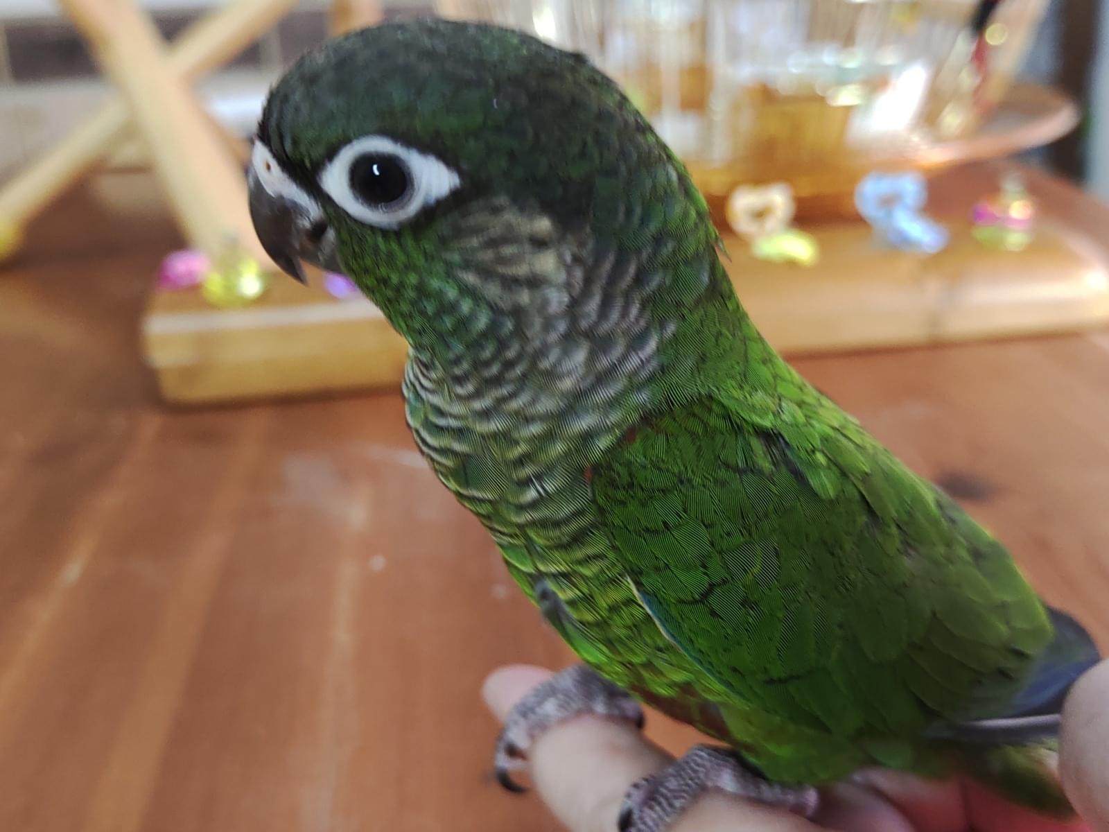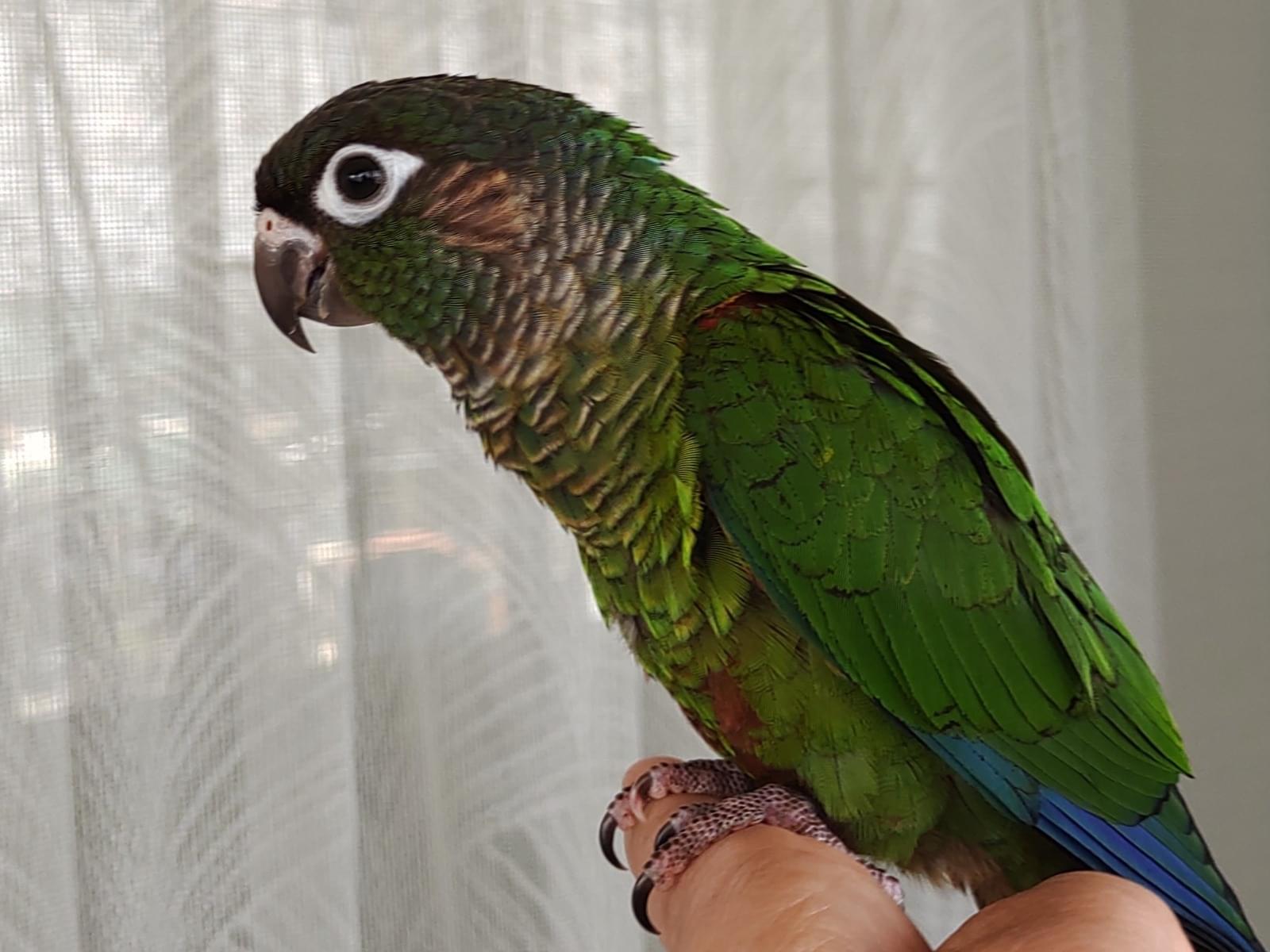 足環はありません。濃い緑色のウロコインコで、一見すると見えませんが羽の下は赤と黄色です。人に懐いています。ぐーちゃんと呼ぶと挙げた手や頭の上に飛んで来ました。