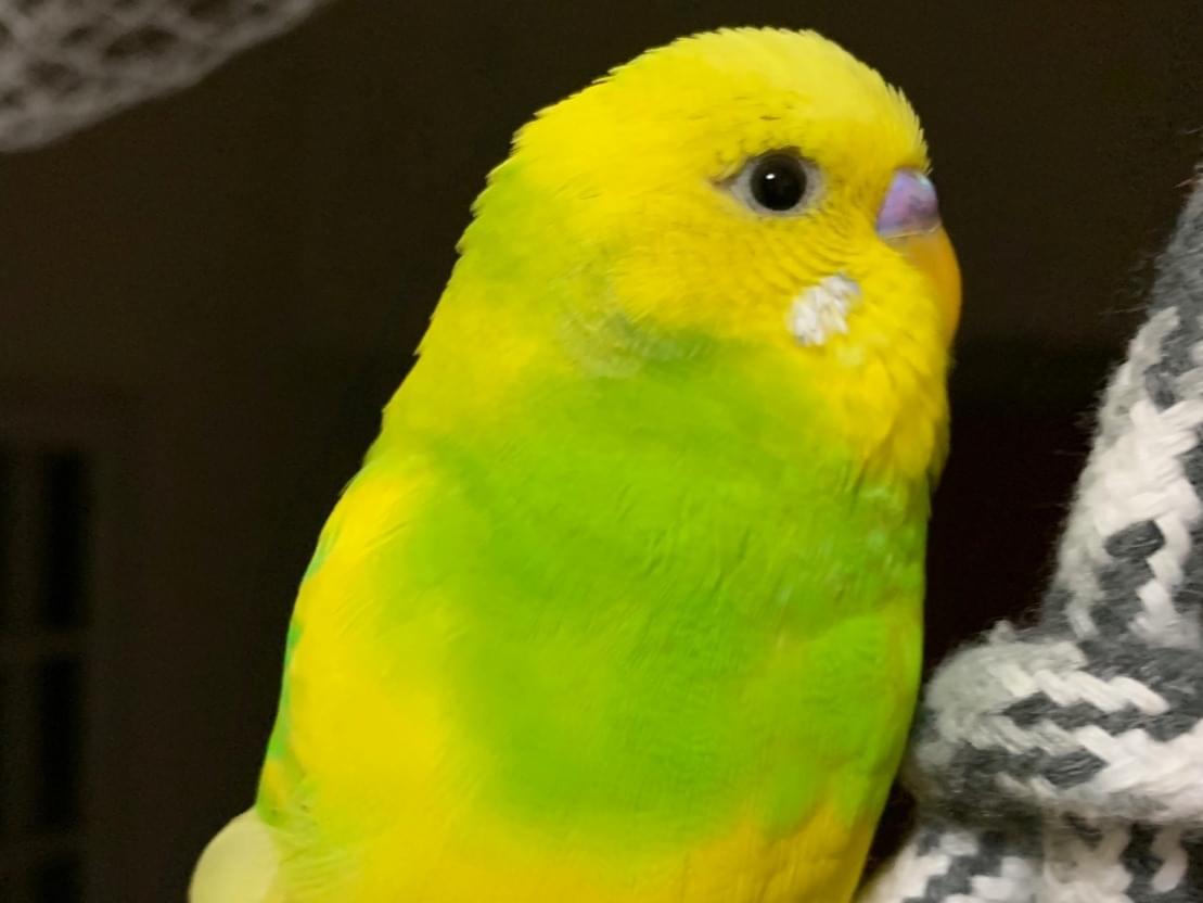 頭と顔は黄色くて胸が黄緑色をしたセキセイインコです。