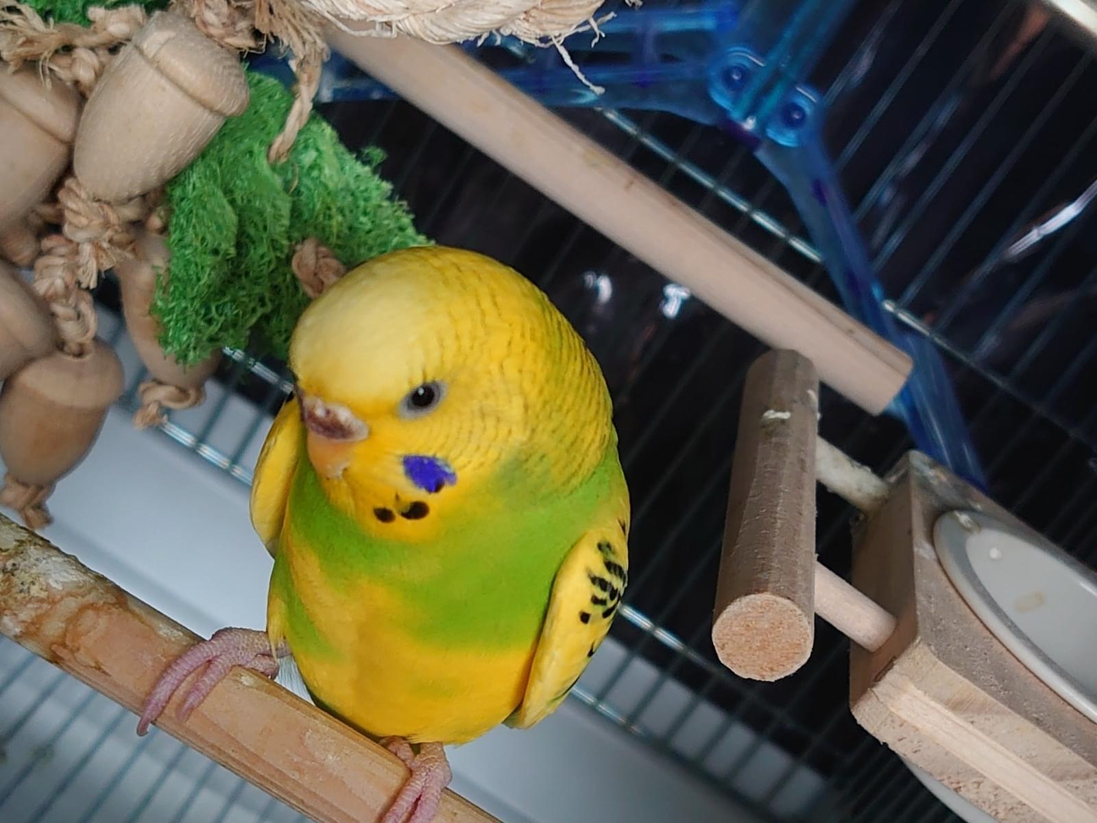 頭は黄色く背中と胸には緑が入っているセキセイインコです