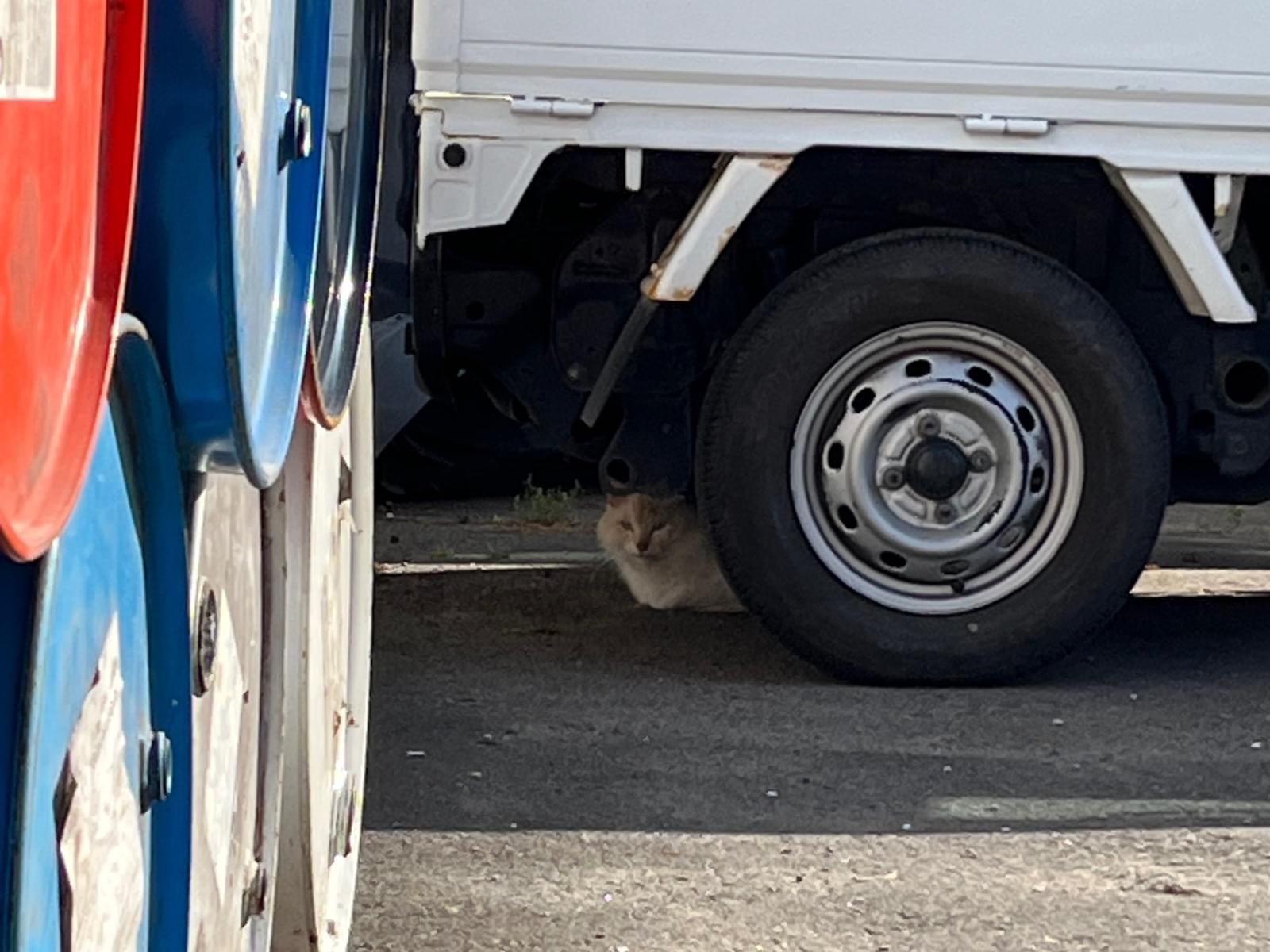 あまり元気がなさそうで、カラスが2羽で狙っていたので助けに行きましたが、猫ちゃんは車の下にもぐって近づく怖がってうなります。