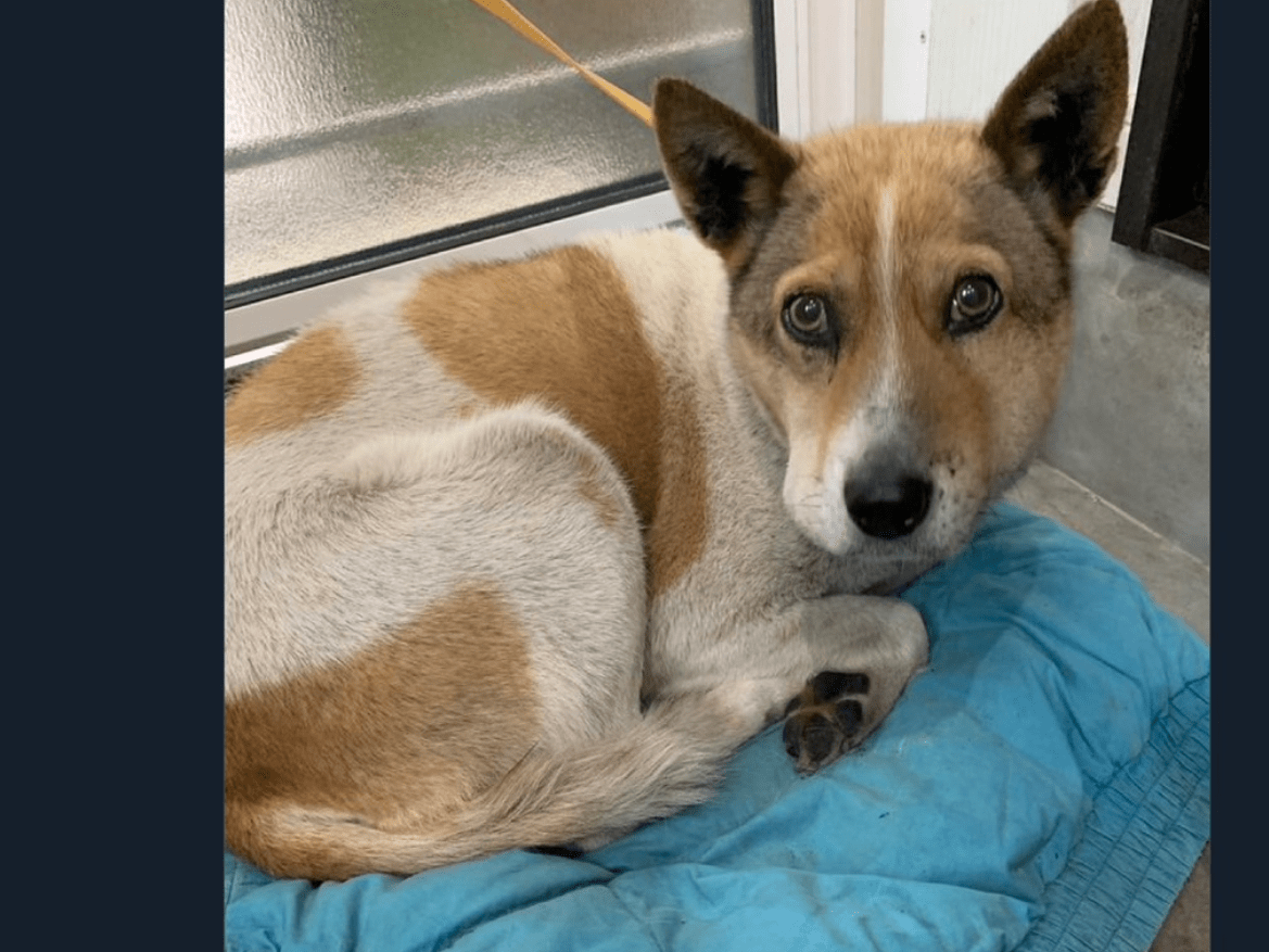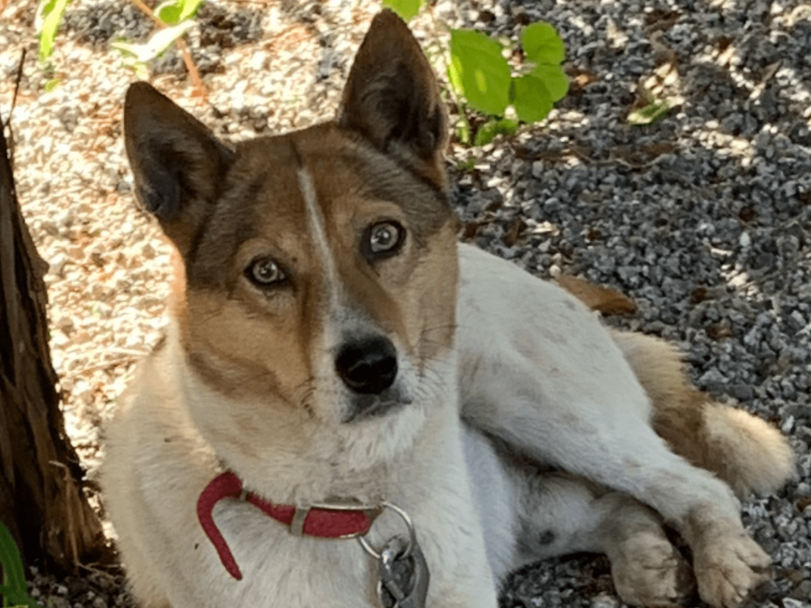 白地に茶色のブチ柄のミックス犬を探しています