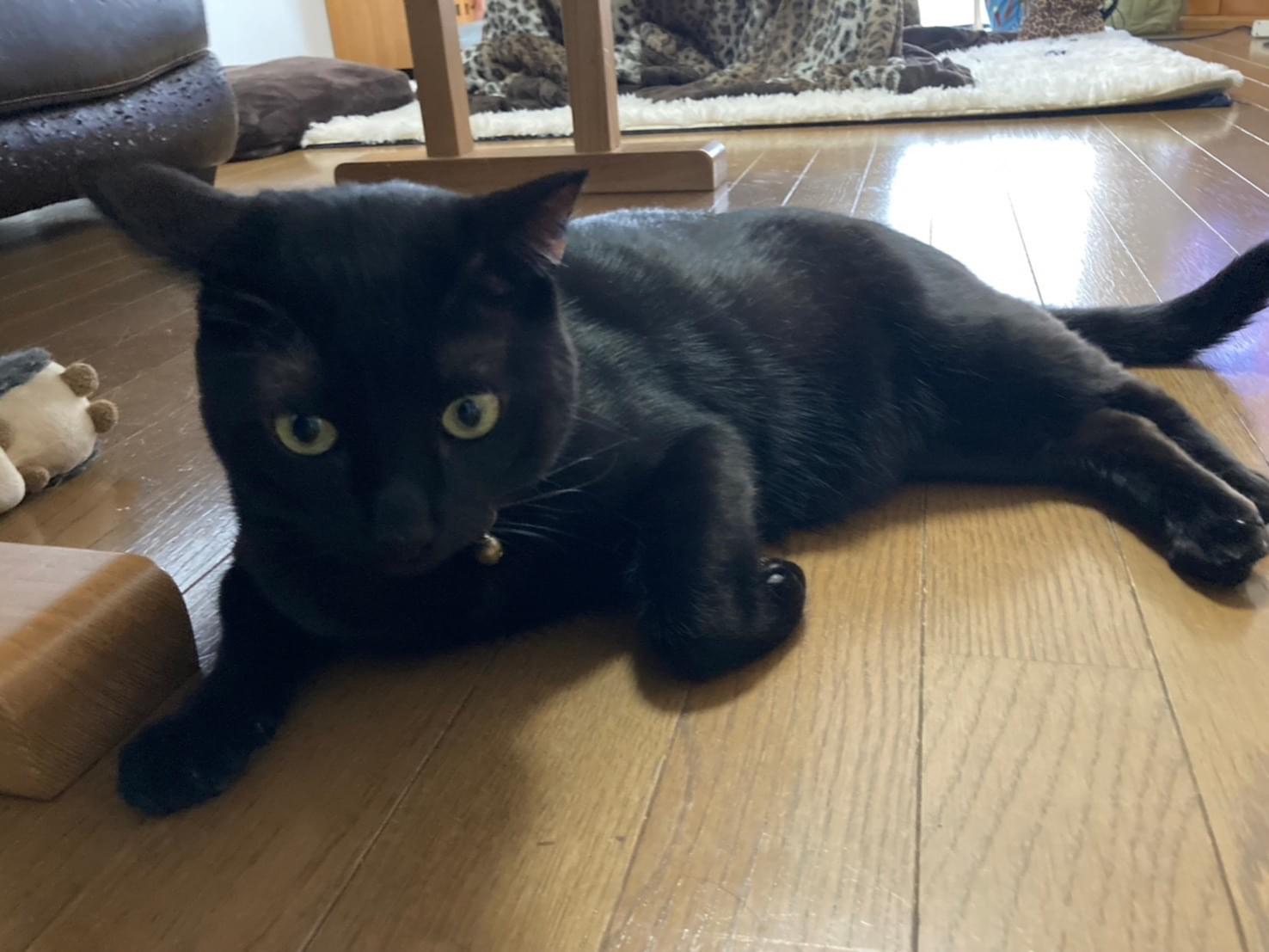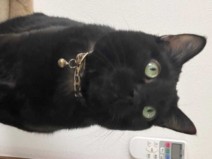 ヒョウ柄の首輪をした黒猫です。7キロはありポッチャリしています。