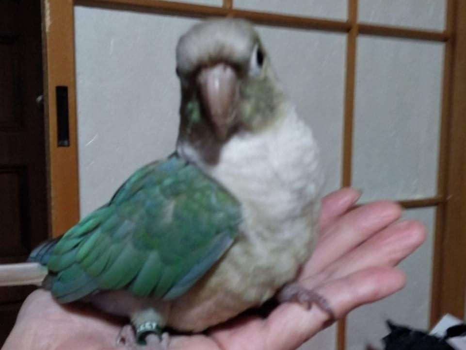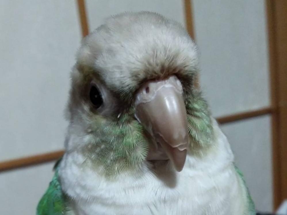 頭がグレーで首から胸にかけて白っぽいグレー、身体は緑系。