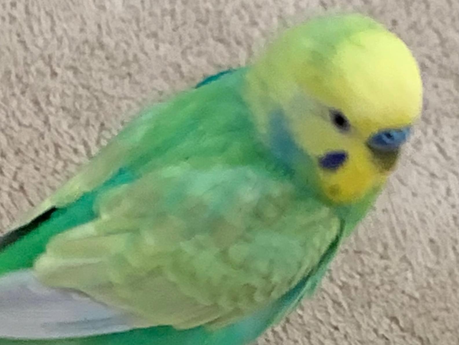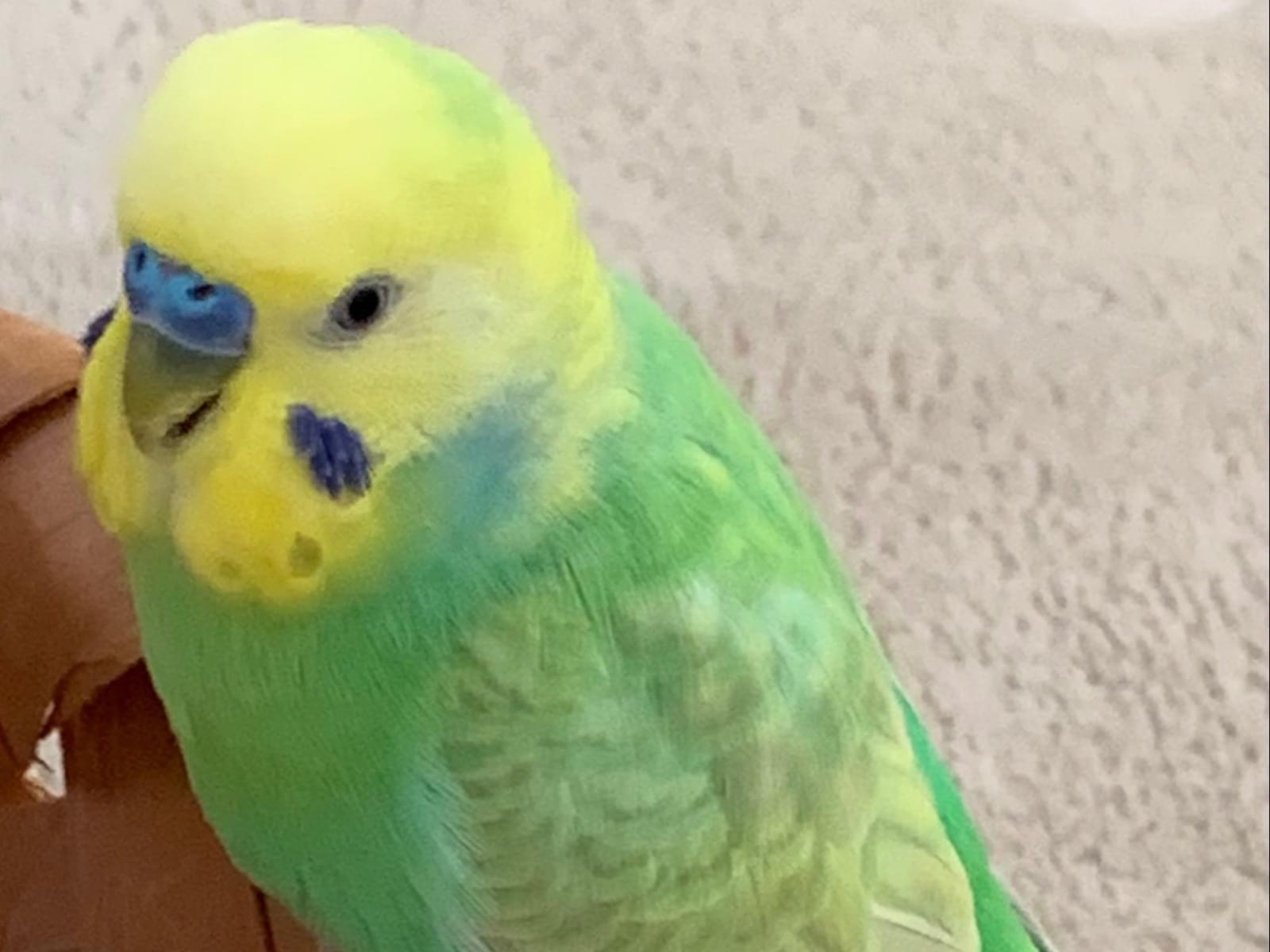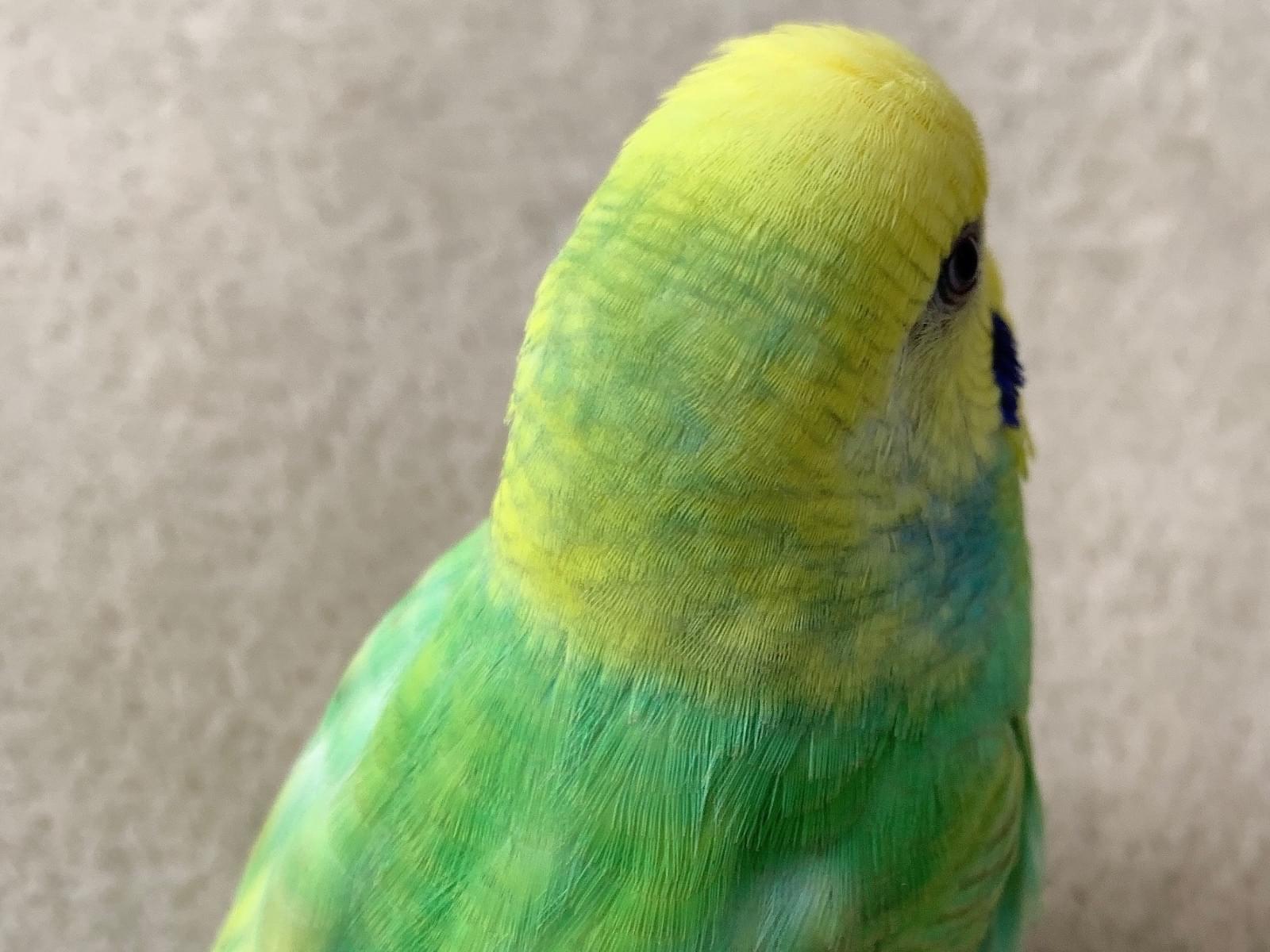 セキセイインコ 顔が黄色、体が緑、 ほっぺが青、鼻が青。