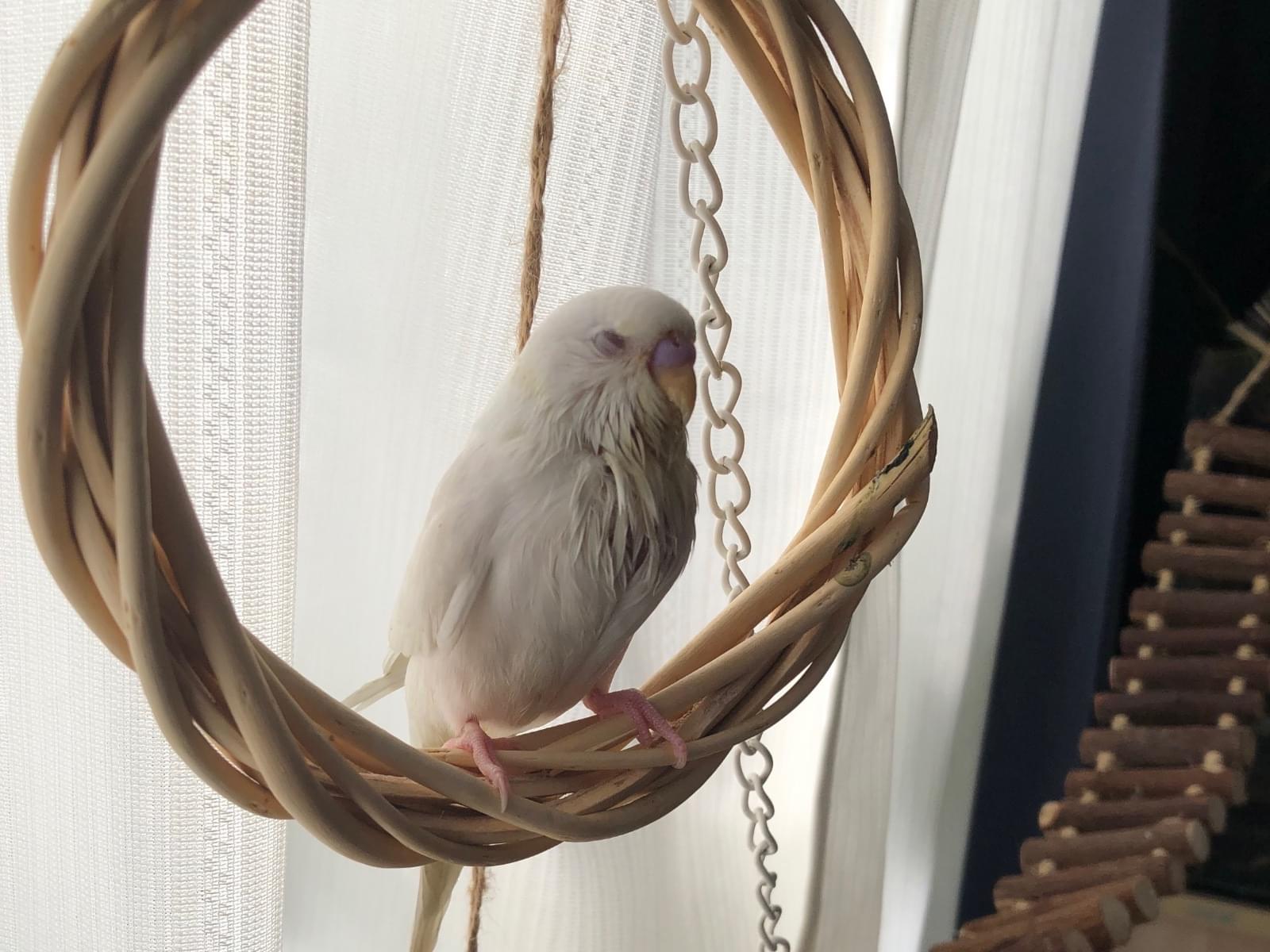 白色セキセイインコで赤い目をしてます