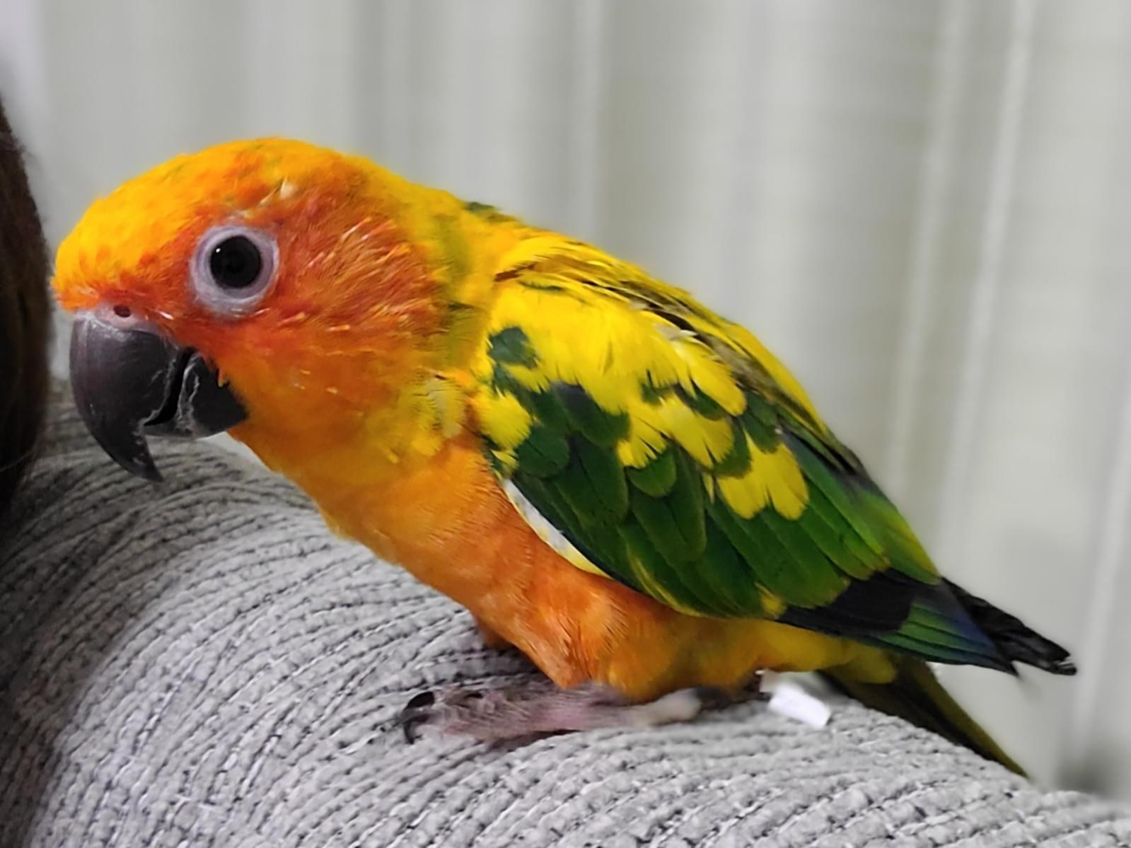 身体はオレンジ色、羽と尾っぽはグリーンとブルーのグラデーションです。
