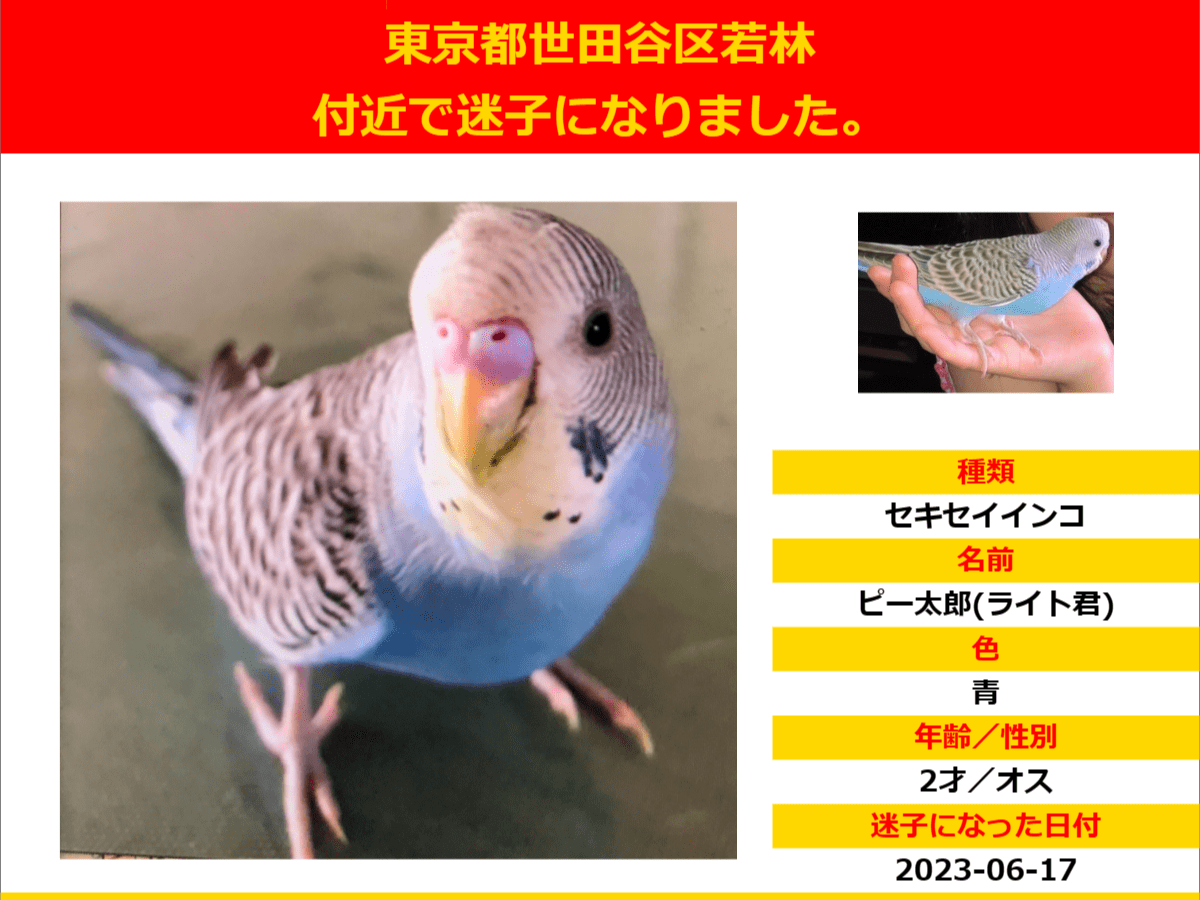 世田谷区、および隣接の市や区の皆さま。17日以降で青いインコを目撃した方、最近保護した青いインコを飼っている知り合いがいる方の情報などもお寄せいただけると有難いです。