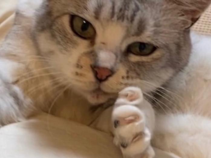 お腹は白、背中は主にグレーのサバトラの雌です。