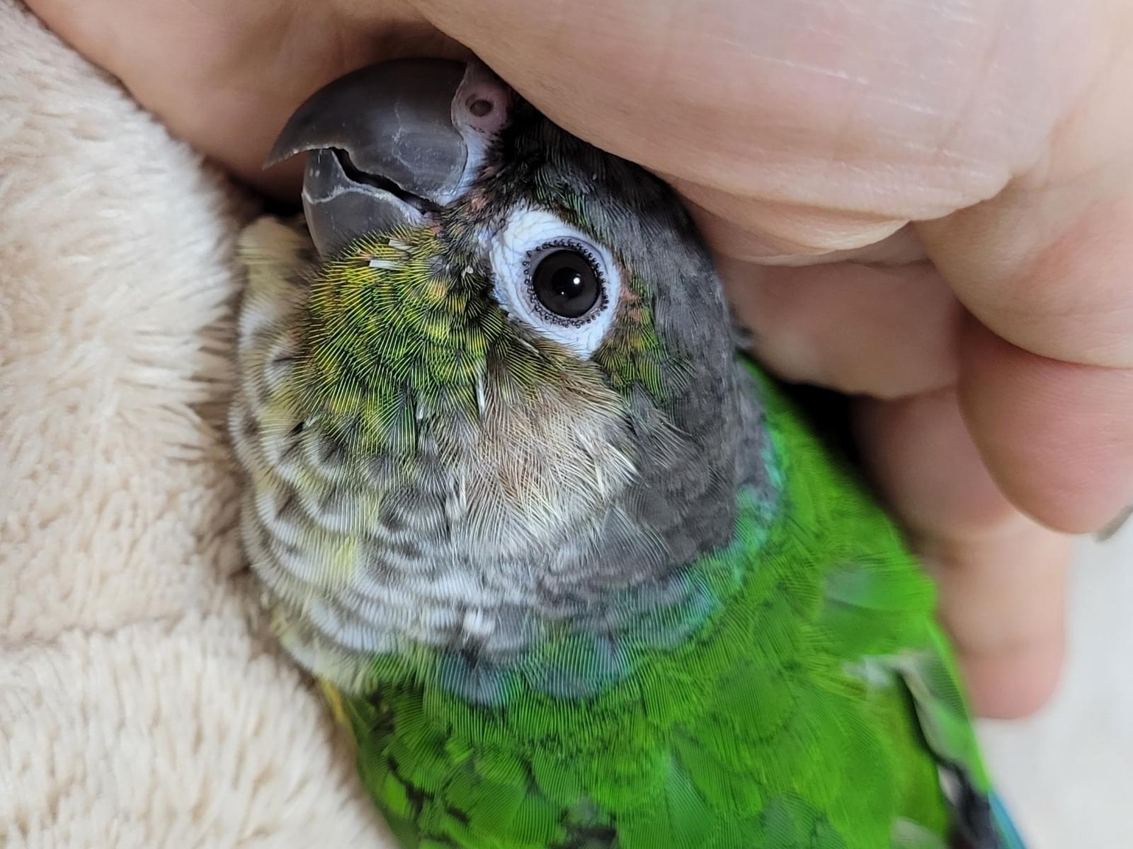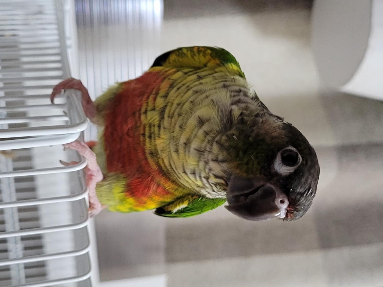 羽が緑色のウロコインコを探しています。頭はグレー(黒に近い)色でお腹にオレンジのハート模様があります