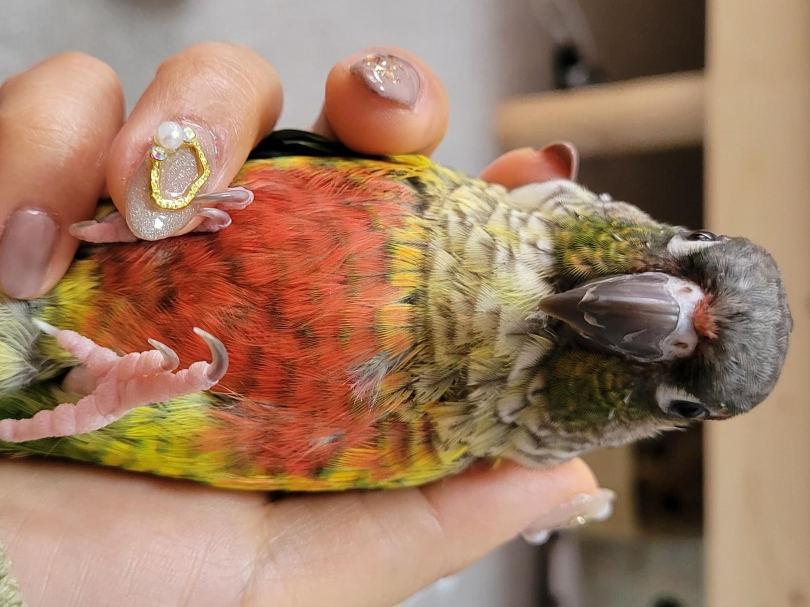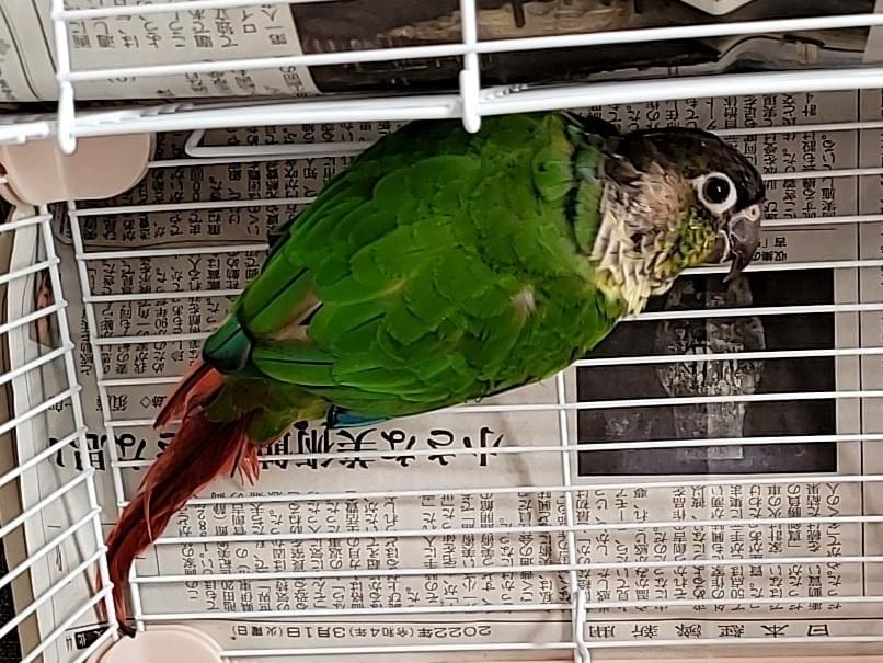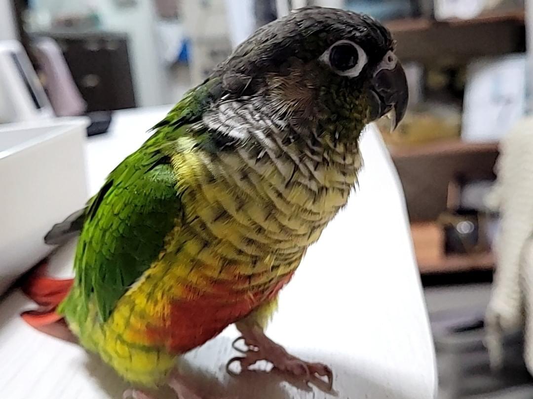 表面の羽は綺麗な緑色で頭は黒に近いグレー色をしています。羽は広げると青っぽい羽がまざっています。その他の羽にはオレンジや黄色、黄緑がまざっています。特にお腹には赤っぽい色でハートのような大きな模様があります。尻尾は赤色で長いです。大きさは尻尾まで20センチ~25センチ無いくらいです。鳴き声は状況に寄りますがキーキー、ギーギー、と耳を突き抜けるようなとても大きな声です。人に馴れていて、手に乗ります。