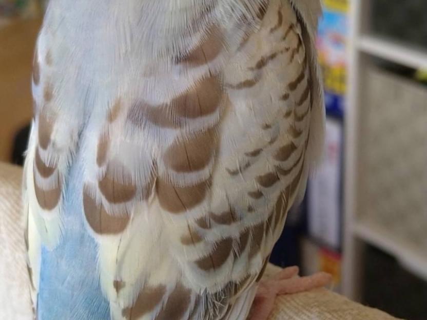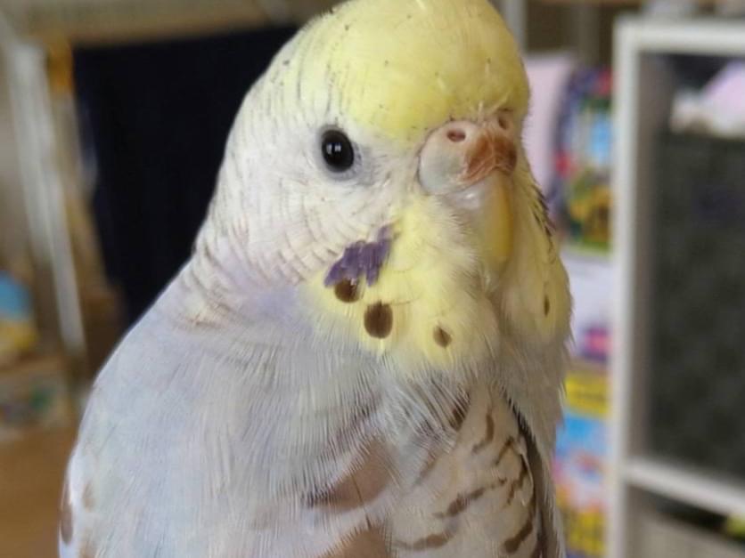 全体的に淡い色で、頭は黄色、身体は水色です。羽は左右対称の綺麗な灰色(若干茶色っぽい、シナモン色)の模様があるコバルトブルーシナモンオパーリンの子です。頬には青いほっぺと、その下にホクロのような黒い斑点が左右合わせて5〜6個あります。