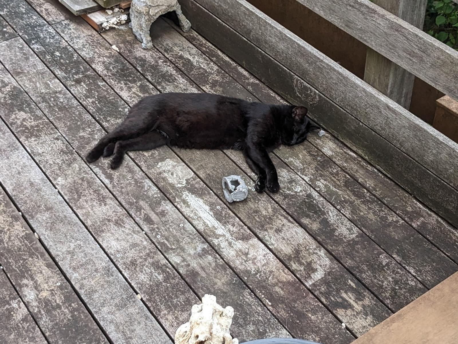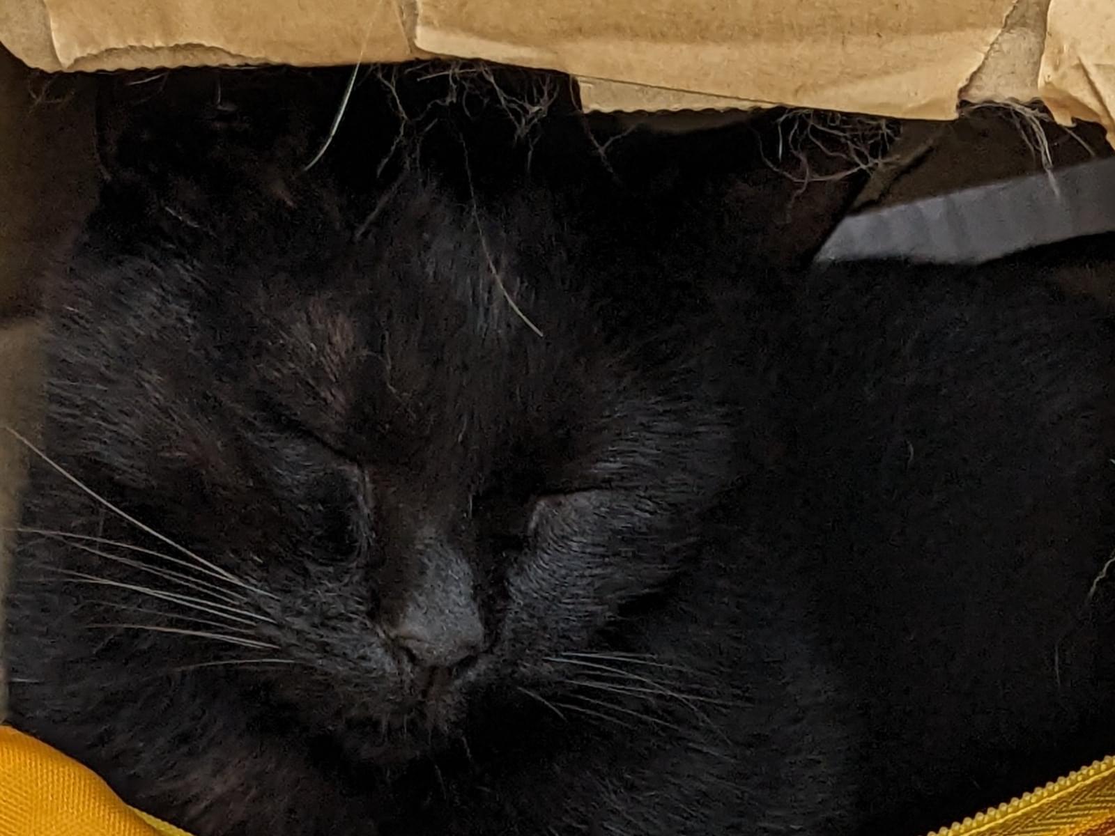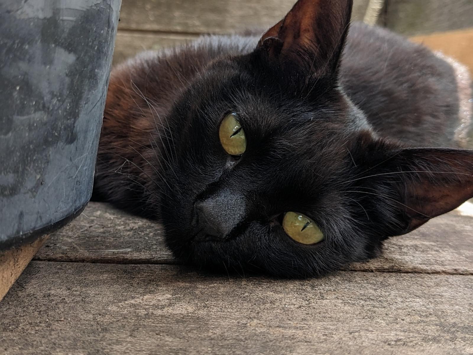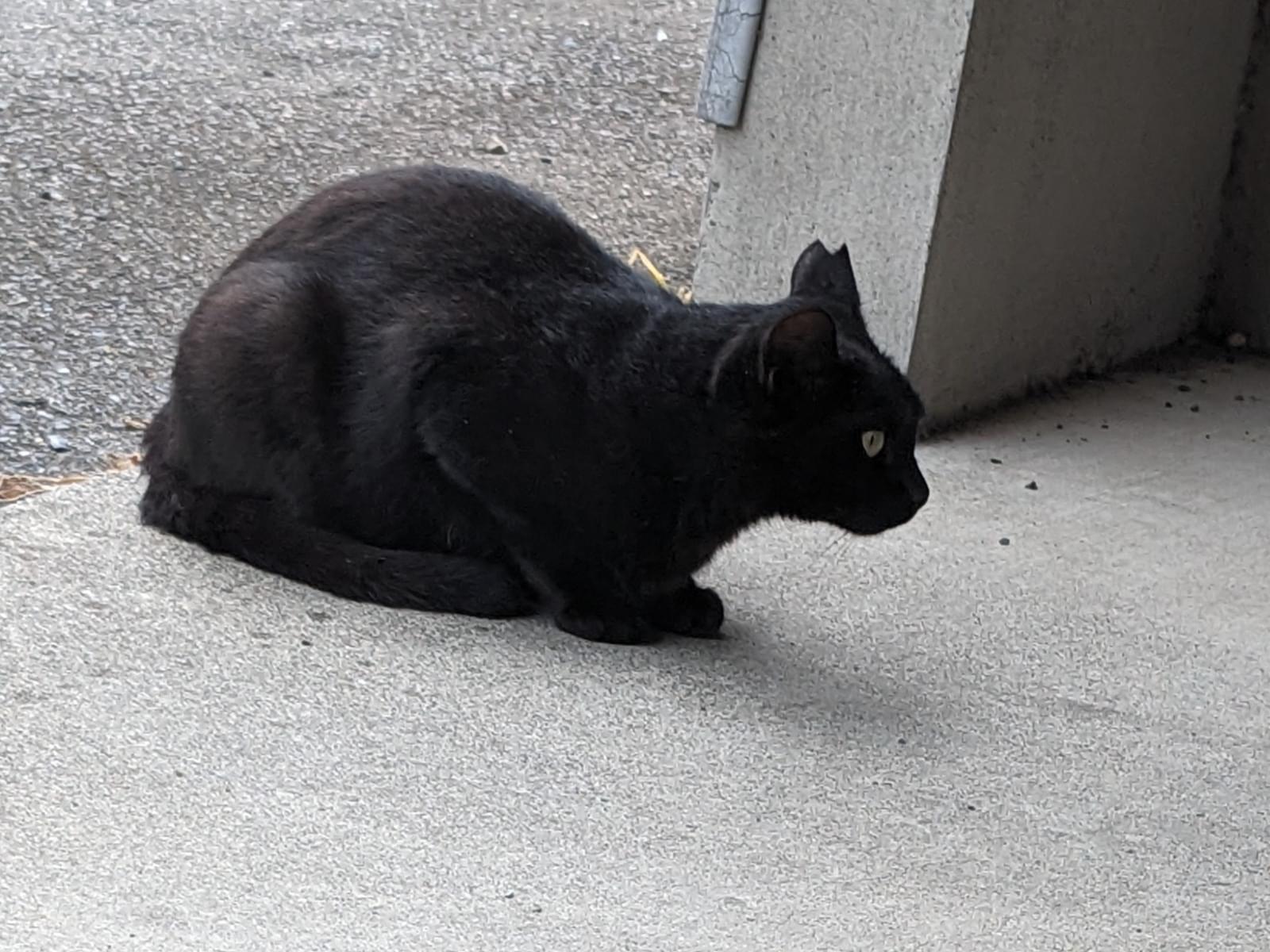 名前はムギで去勢済みのメスです、黒猫で目は黄色お腹の辺りの毛が白だったり茶色で薄いですす次期によって違うかも?
