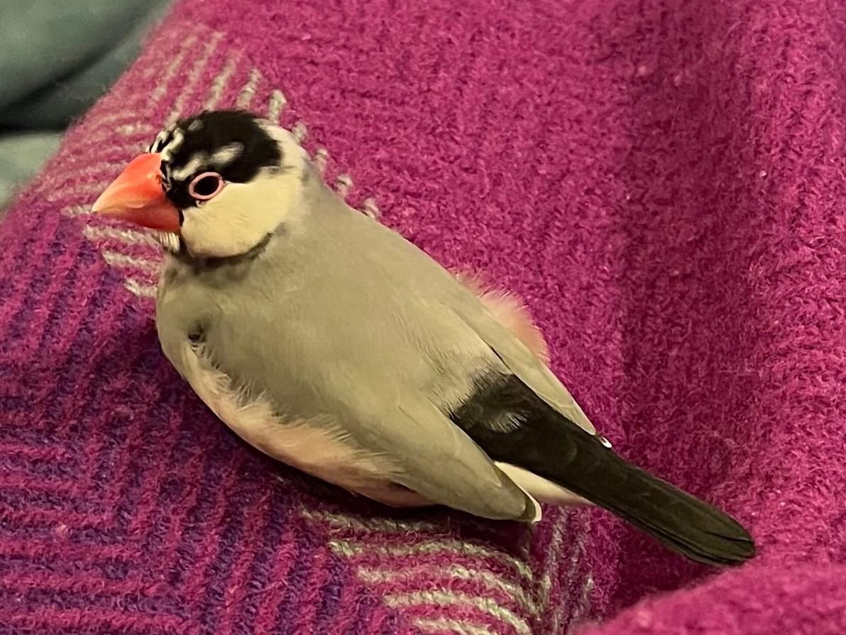 頭は白が混ざった黒、体はグレー、尾羽は黒の桜文鳥です。