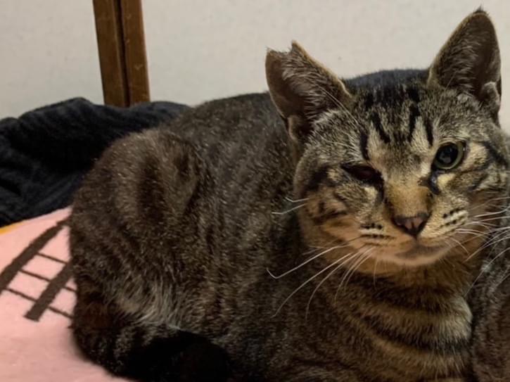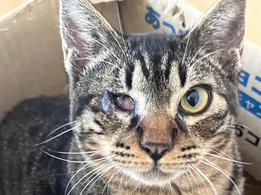 無い方の右目はそのときによって瞼がくっついていたり、赤く充血していたり、白かったりします。