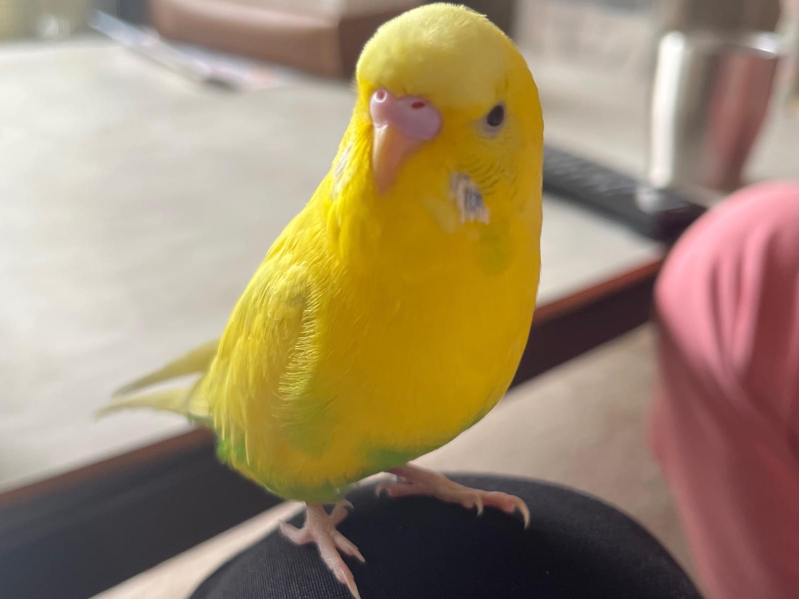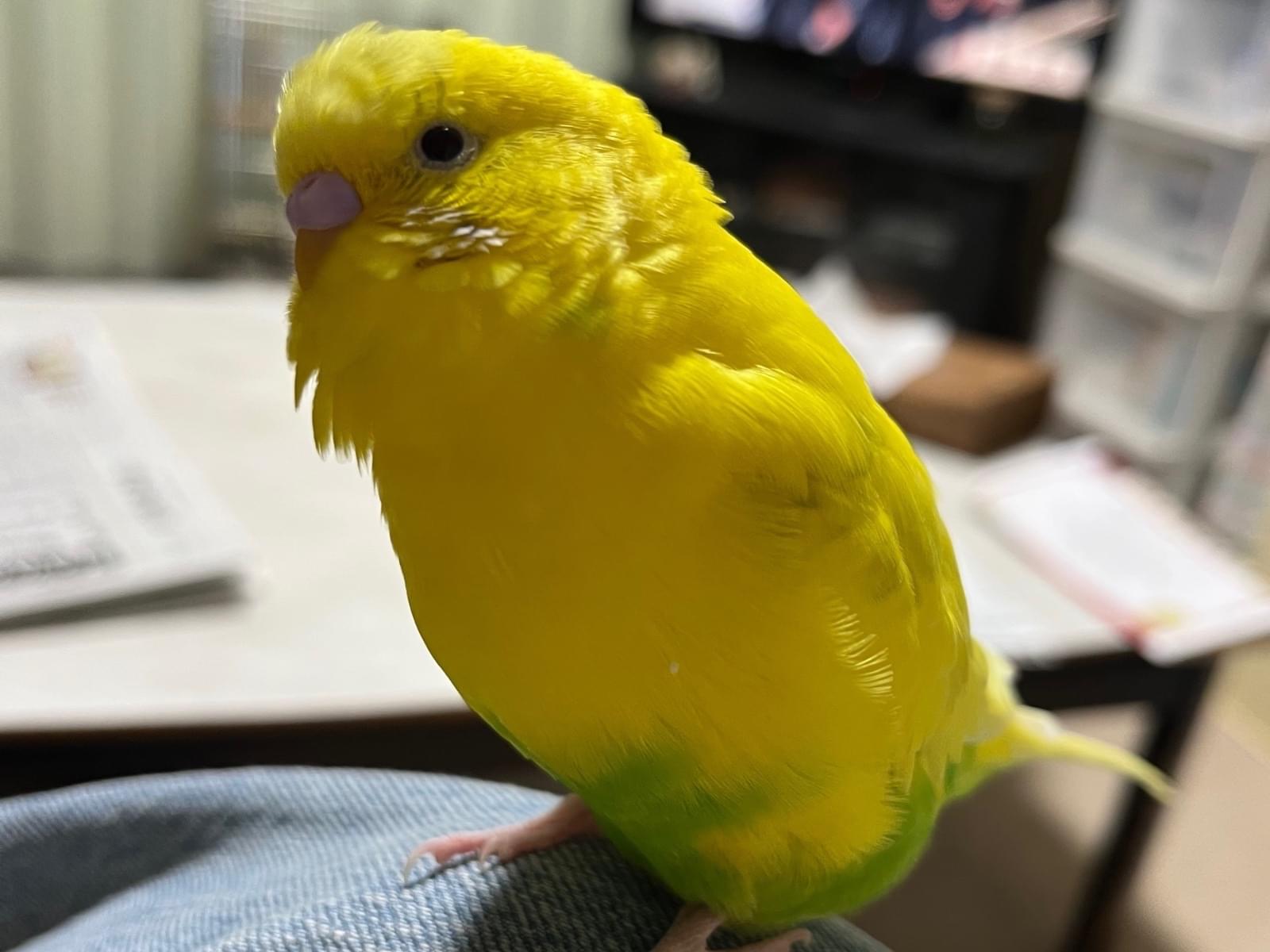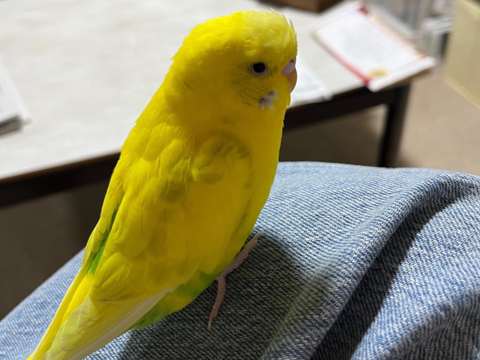 黄色でお腹からお尻にかけて黄緑の毛色をしてます。背中の所々に黒も入ってます。ほっぺの所は青と白です。