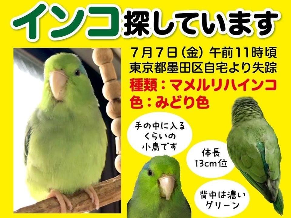 7月7日の正午頃、逃がしてしまいました。2~3日の間は同じ町内で目撃情報を数件いただいていました。街の木々に紛れてしまうような若葉色のひよこサイズのインコです。カラスに襲われて足を怪我しているとの情報がありとても心配しています。人にベタ慣れではないです。目撃された方、保護された方、情報をお持ちの方、ぜひご連絡をお願いいたします。