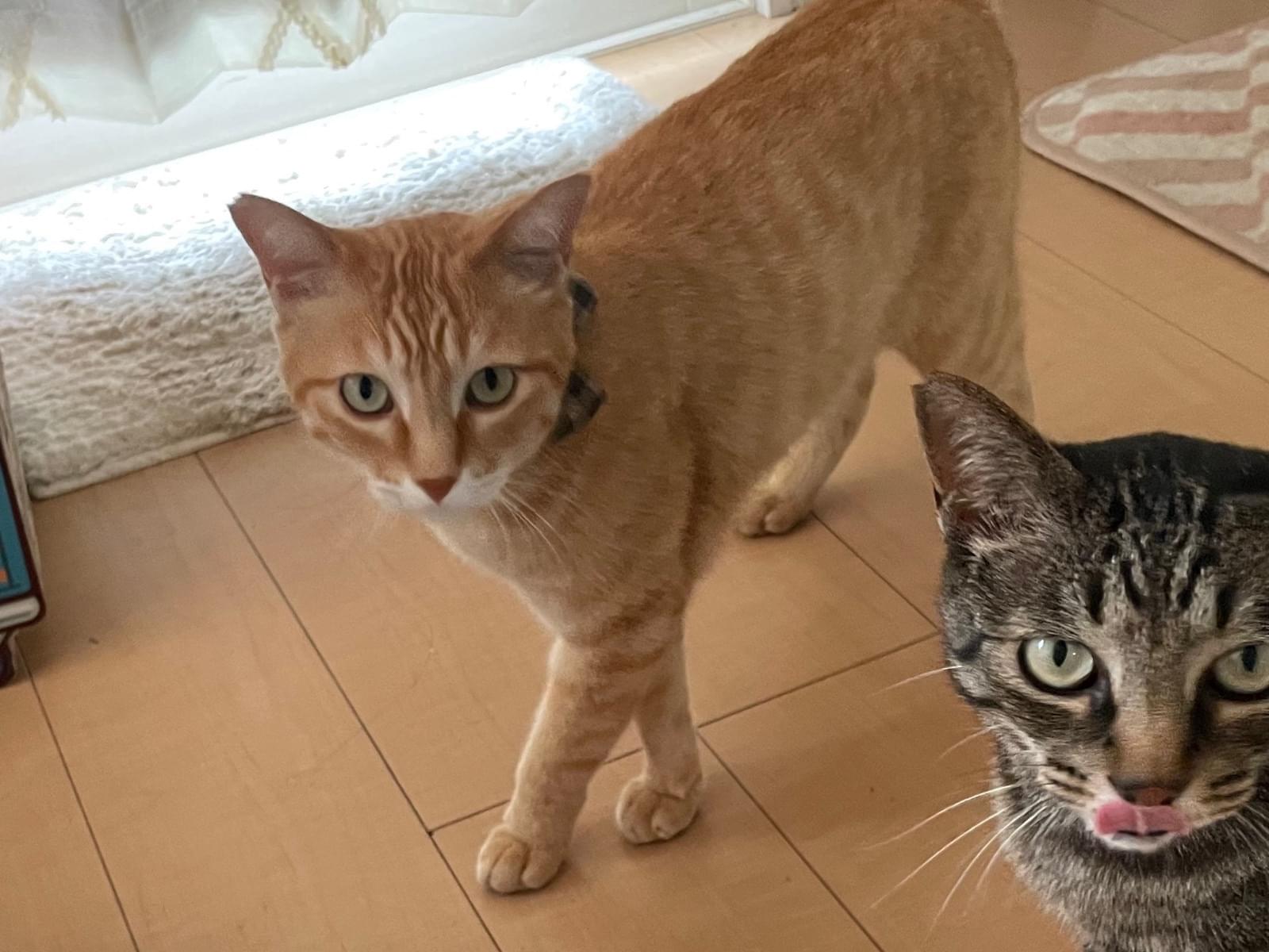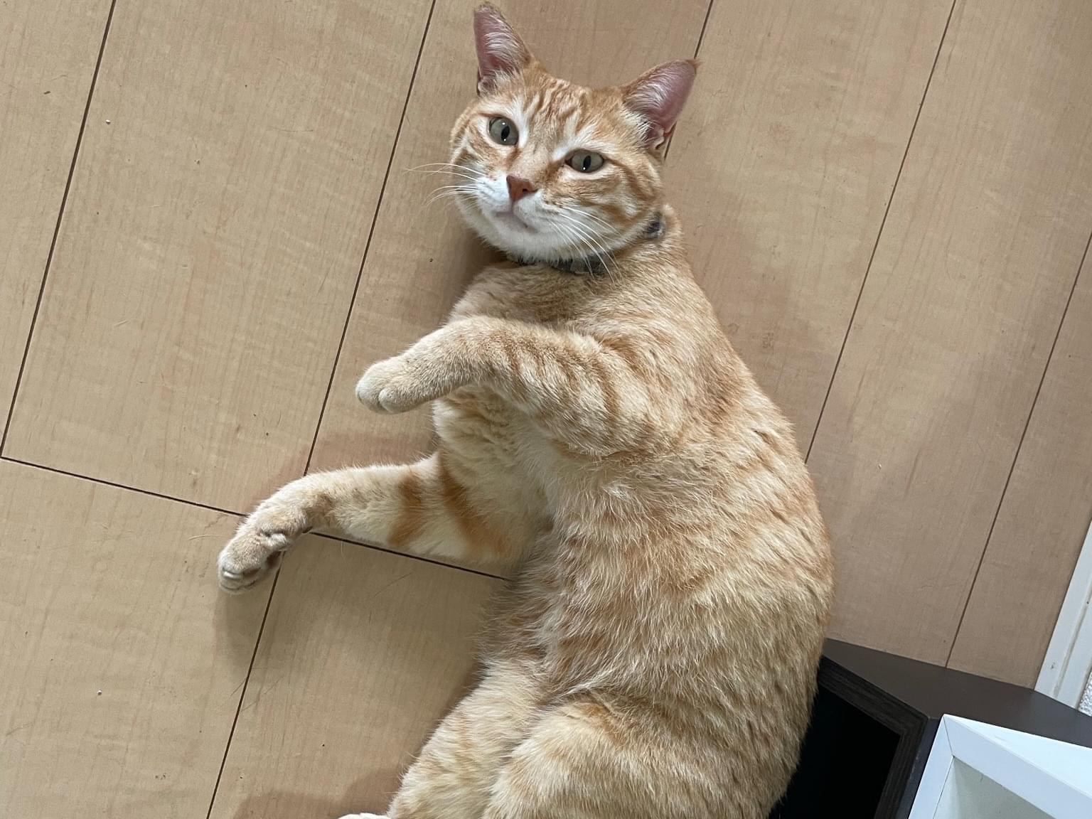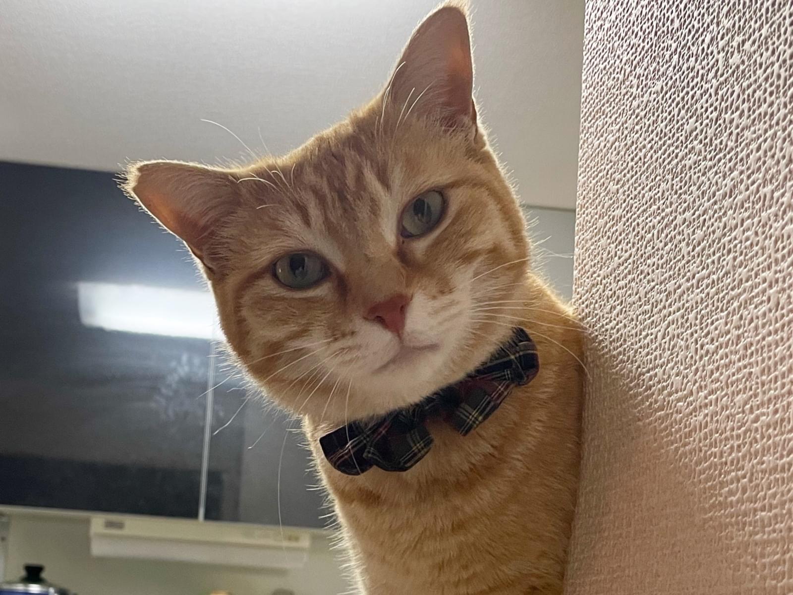 外れているかもしれませんが、牛柄の首輪を、しています。リボンもついています。
