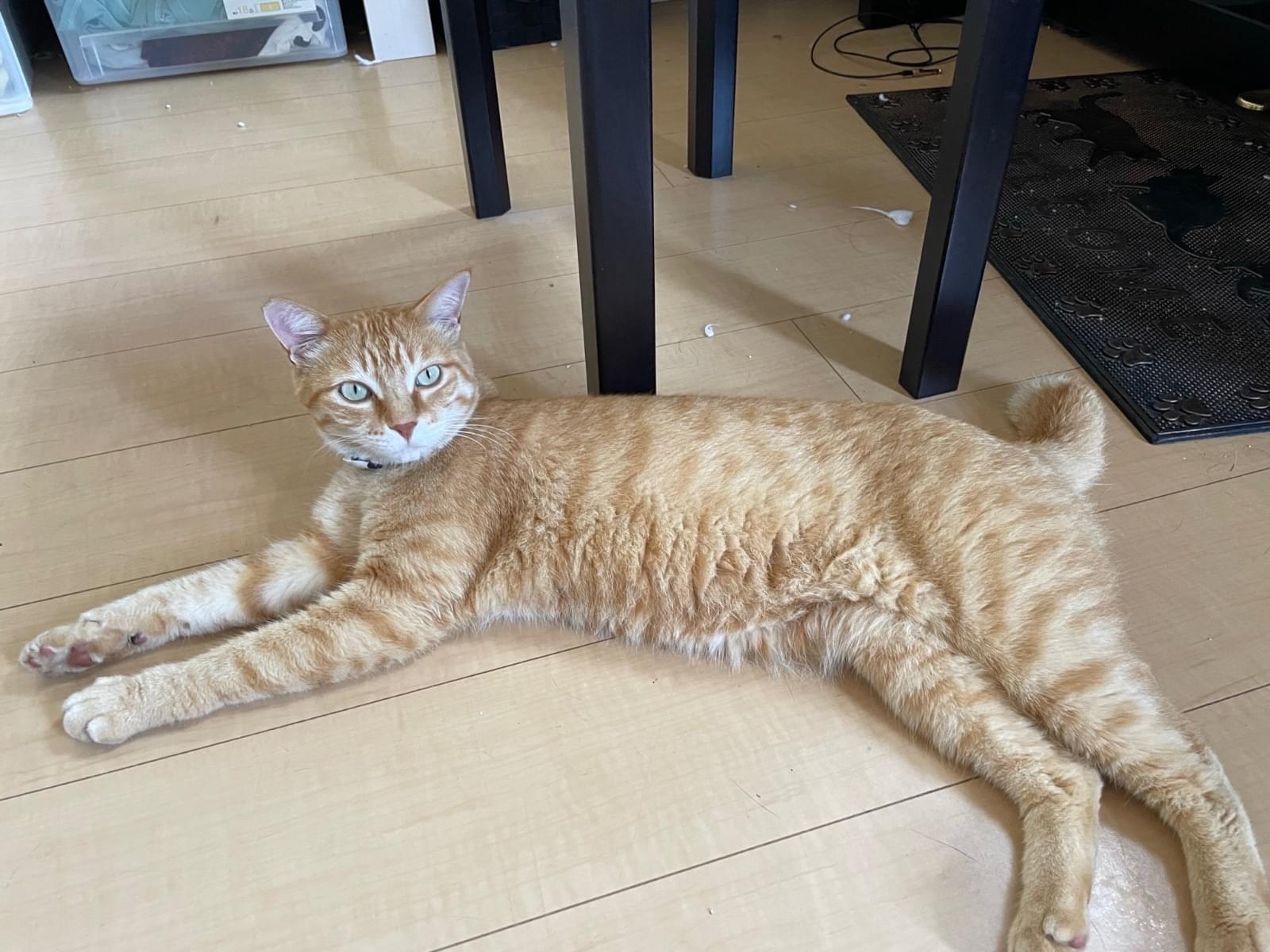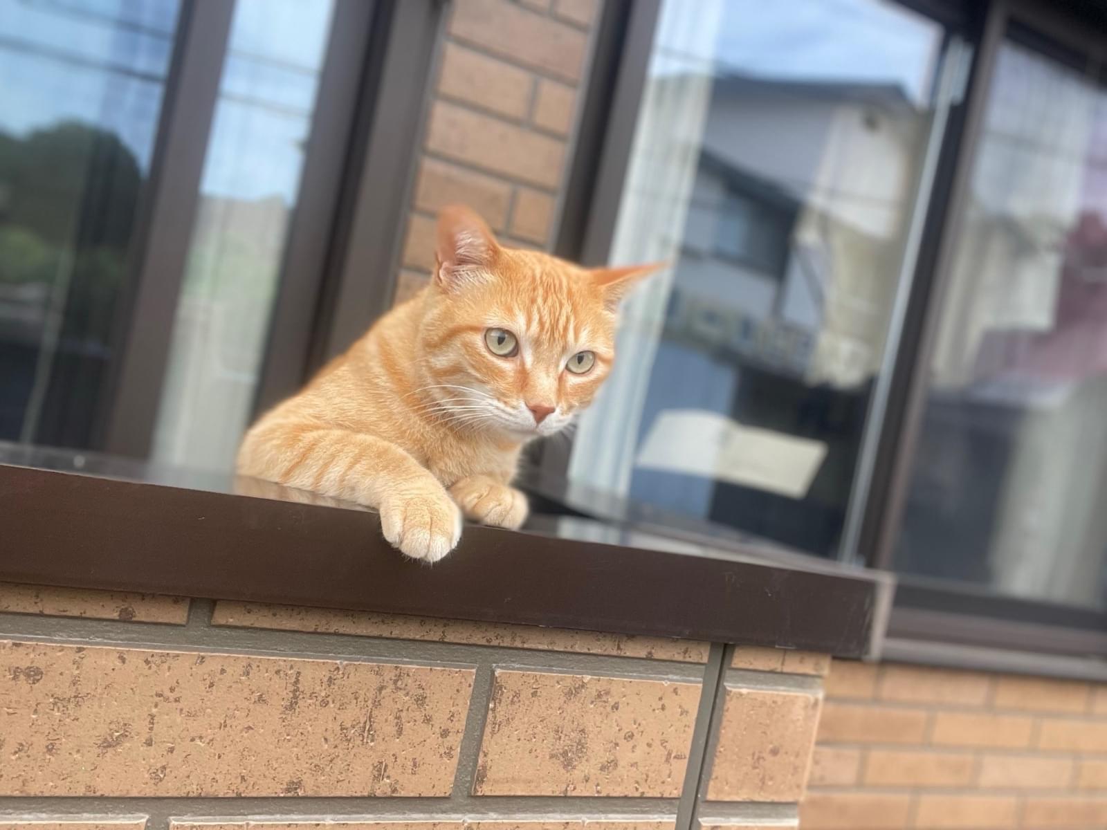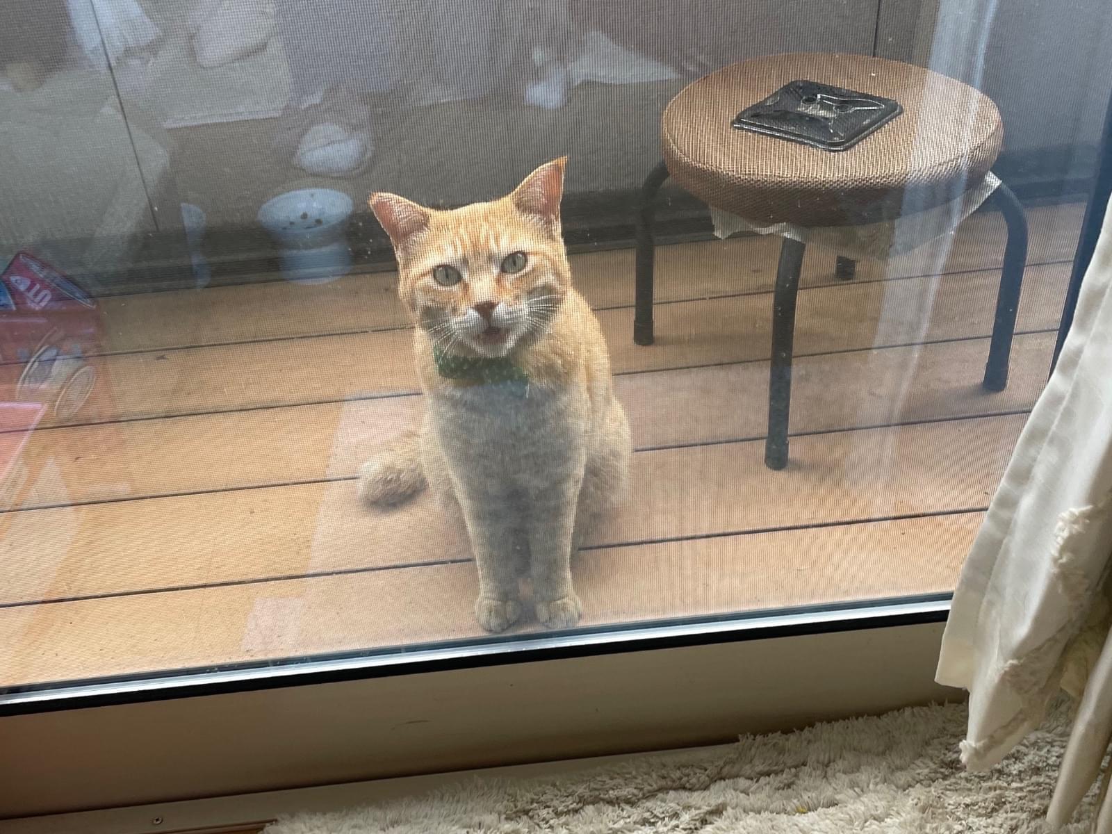 外れているかもしれませんが、牛柄の首輪を、しています。リボンもついています。
