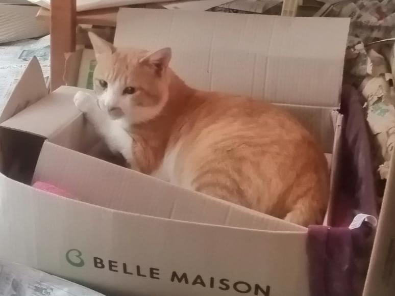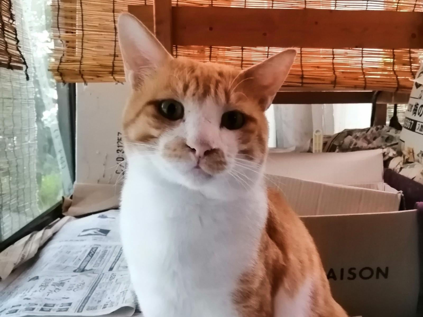 後ろ姿は茶トラに見えますが、鼻から腹にかけて白く、頭頂部が2つの山のように左右に分かれています。