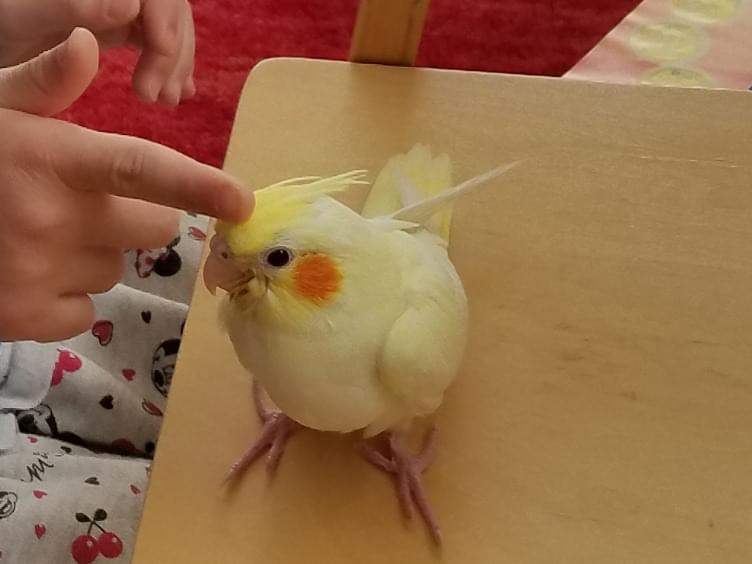 全身薄い黄色、ほっぺオレンジの、オカメインコです。