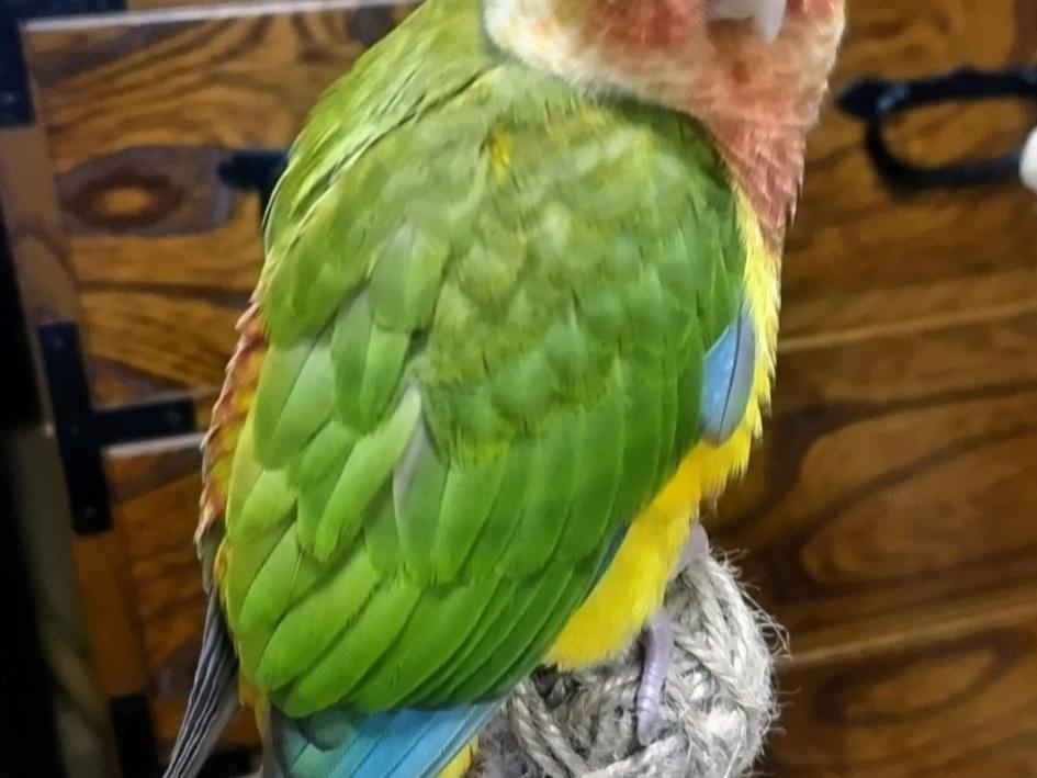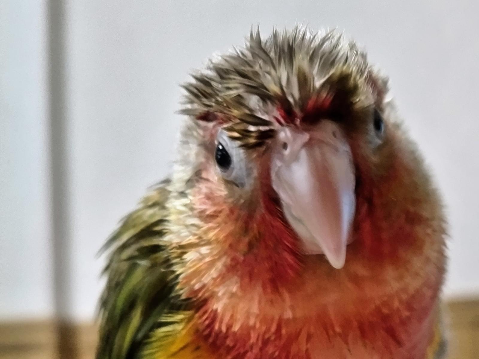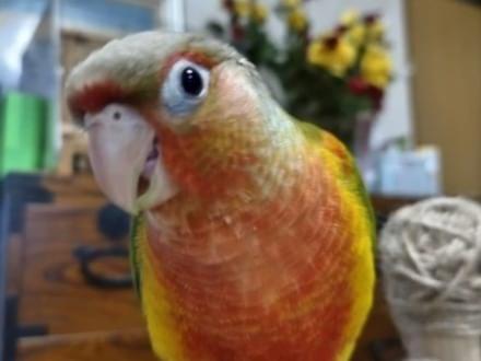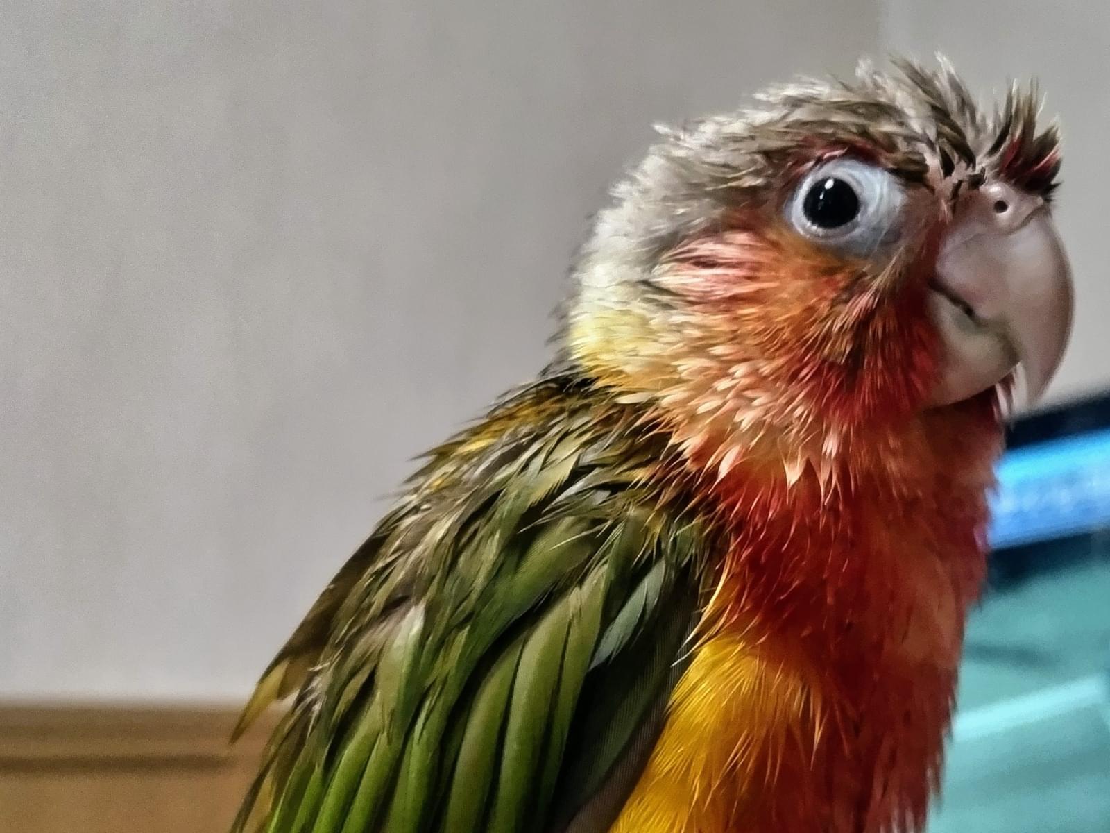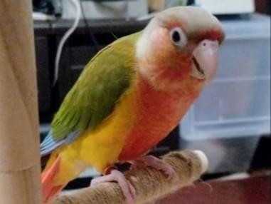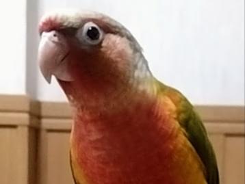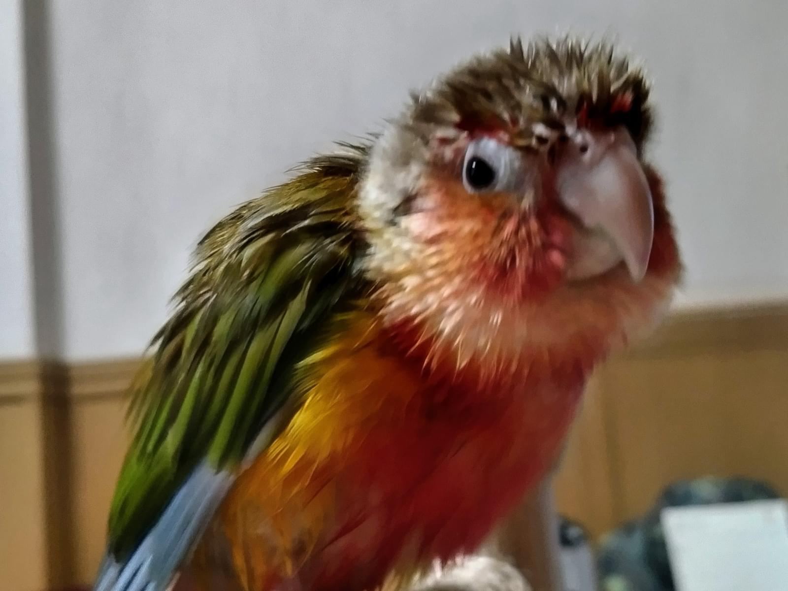背中の羽は緑色、胸~腹は中央オレンジでサイド~足が黄色です