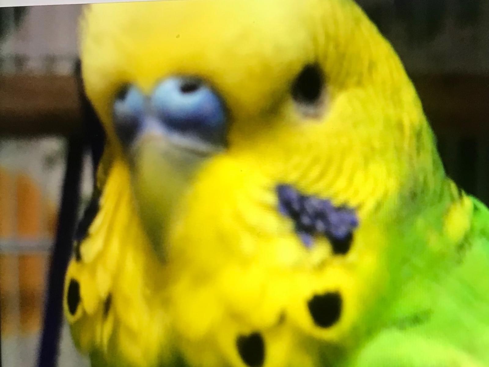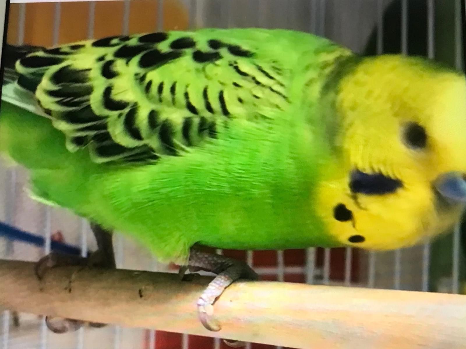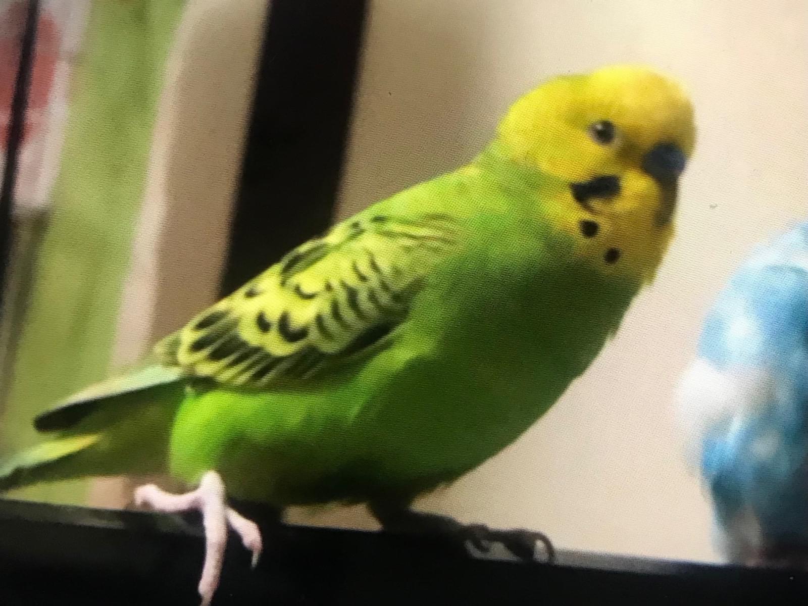 セキセイインコ、雄です。黄緑でところどころ、黒、黄です。活発で、よくしゃべります。「ピーちゃん、ももちゃん、バイバイ、ハイ、もしもし」等。