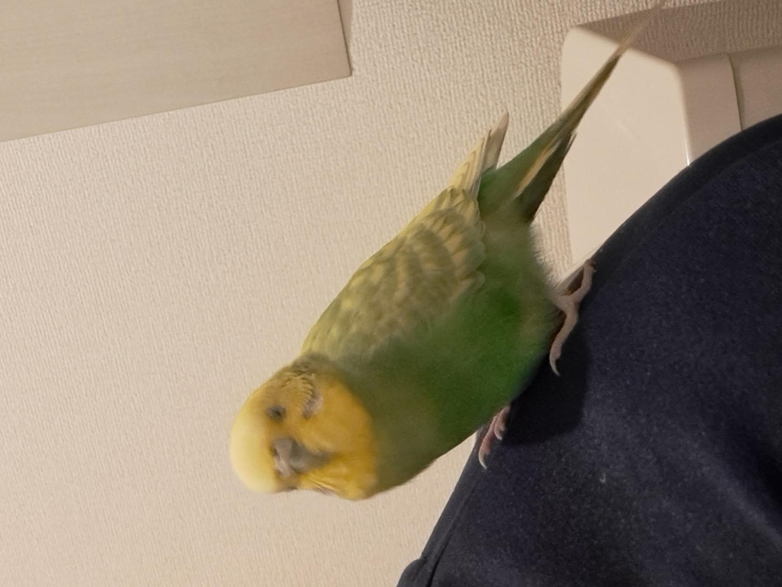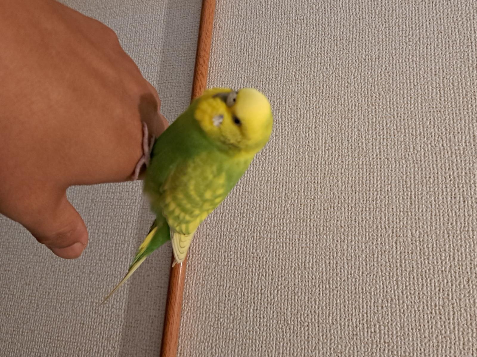 頭が黄色、体が緑色のセキセイインコを保護しました