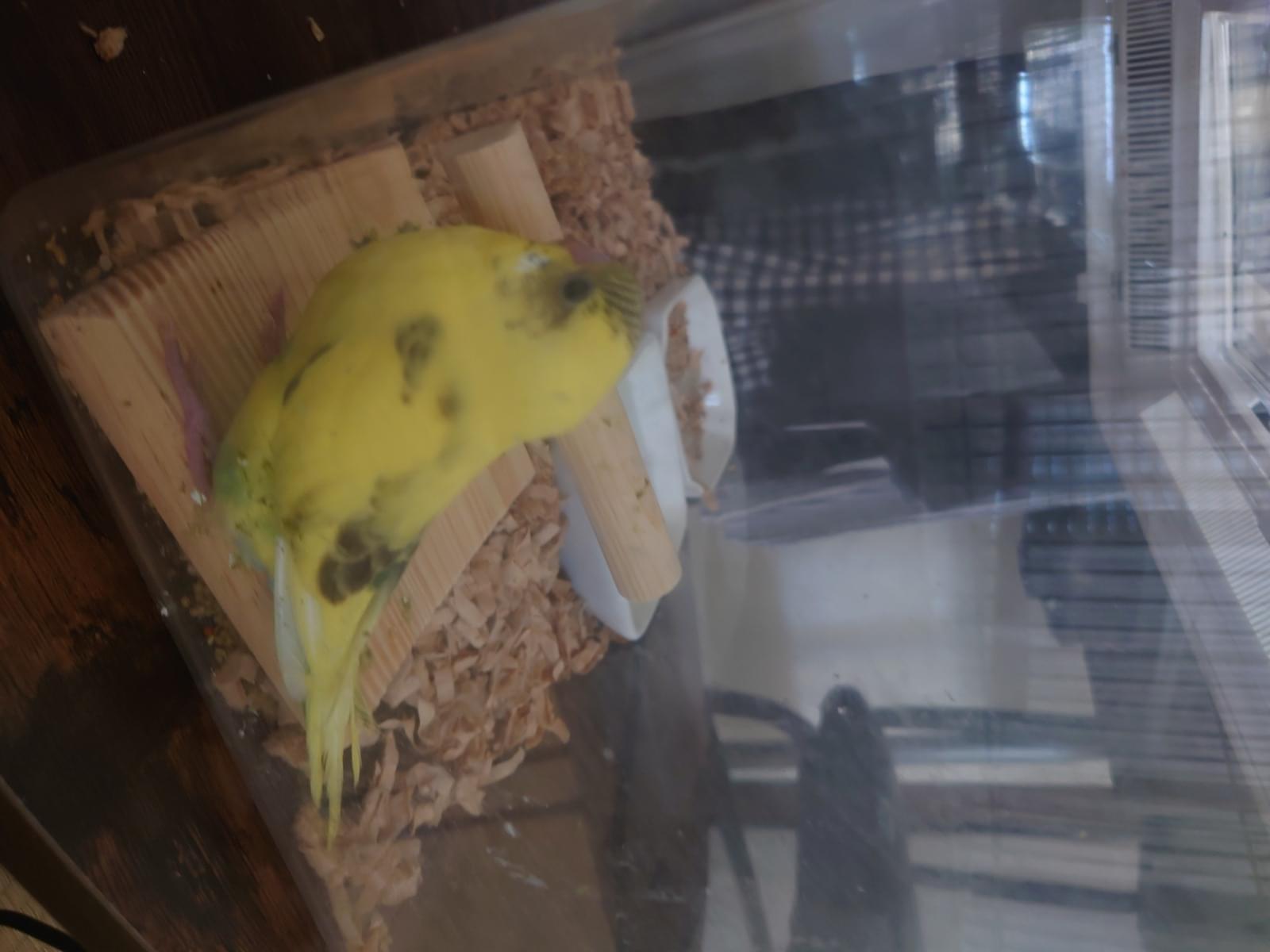 黄色に黒いブチ、顔に黒い模様あるセキセイインコが迷子になりました。