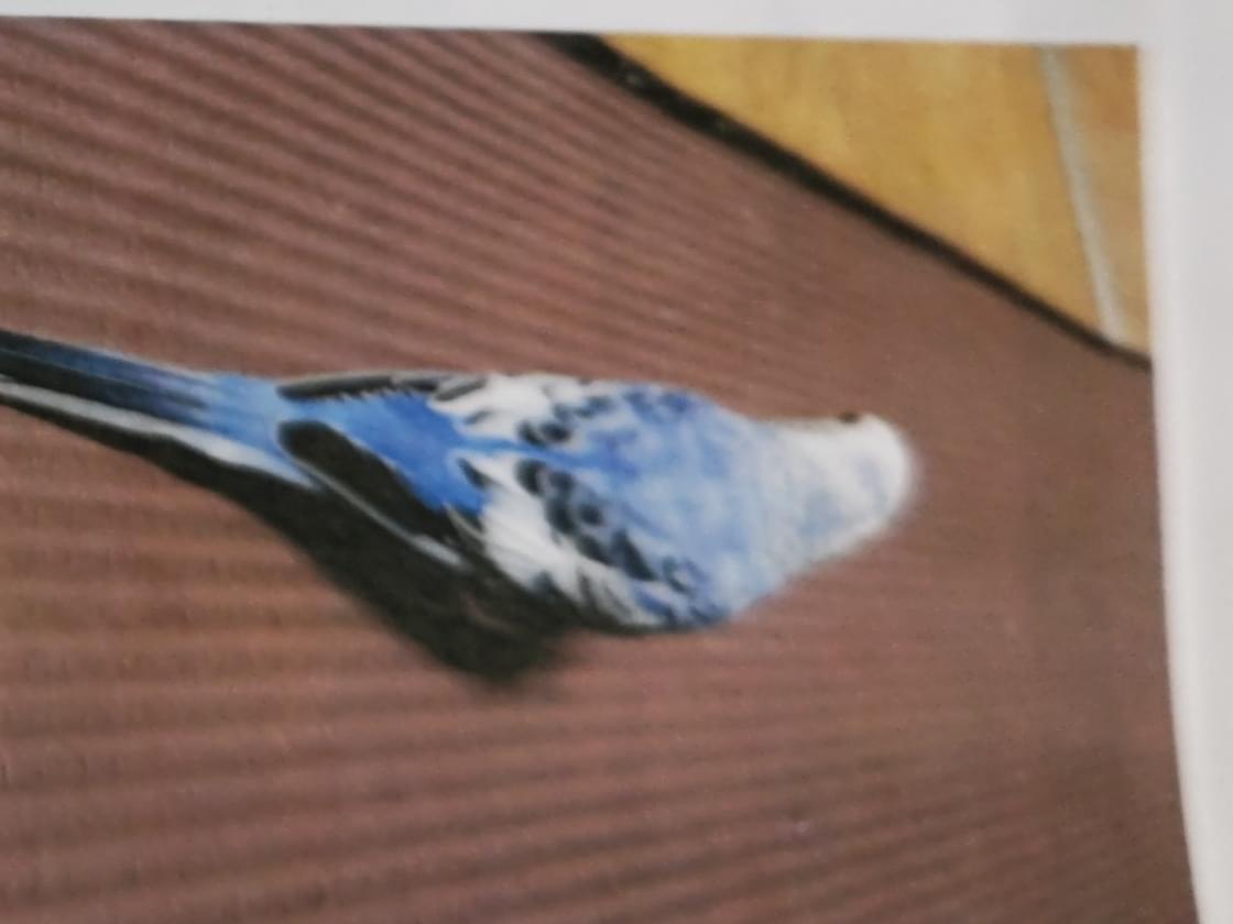 藤色がかった水色に近い青。頭は白。鼻は白です。羽根は黒と白のうろこ模様。尾羽根は紺色。