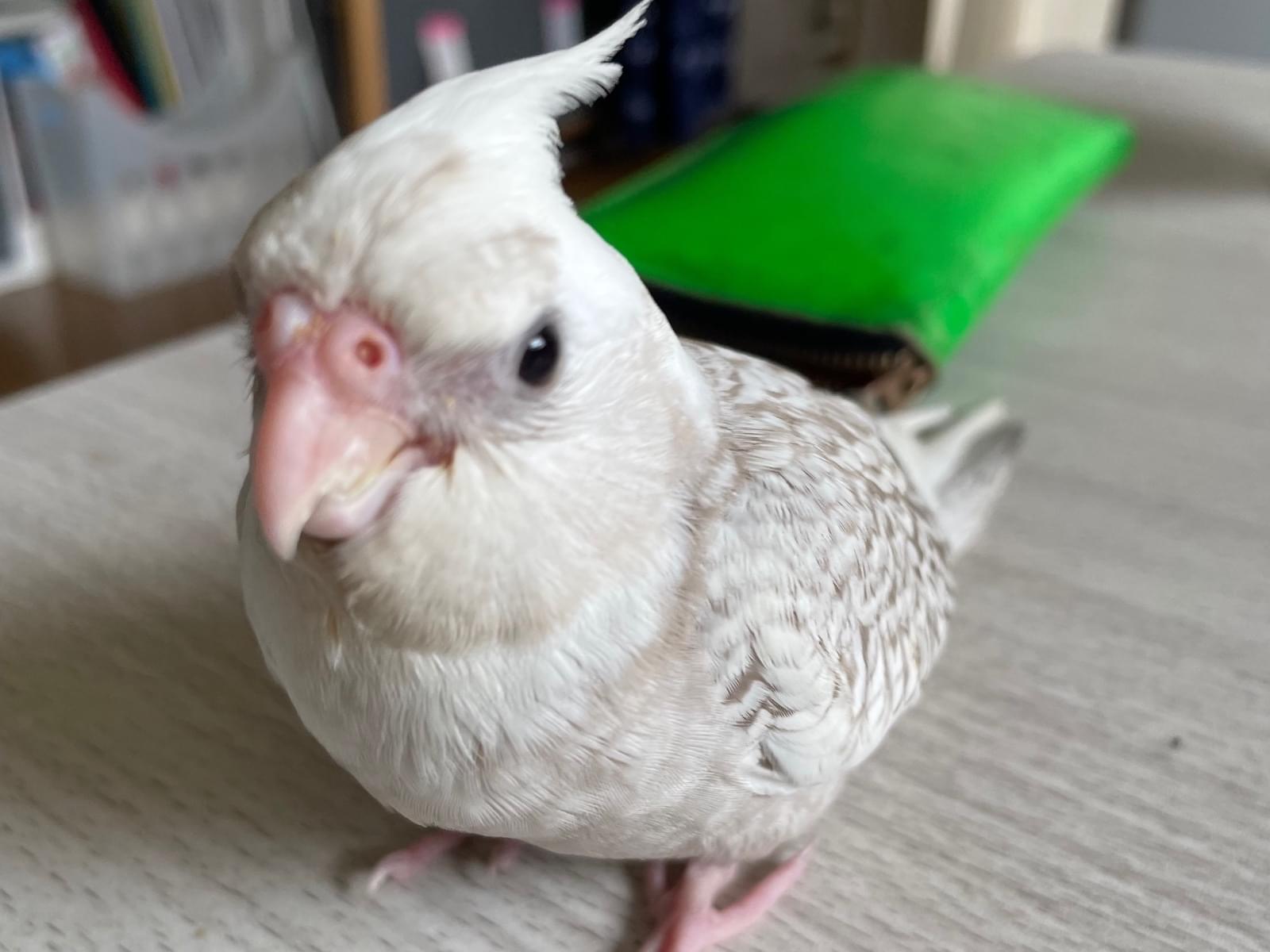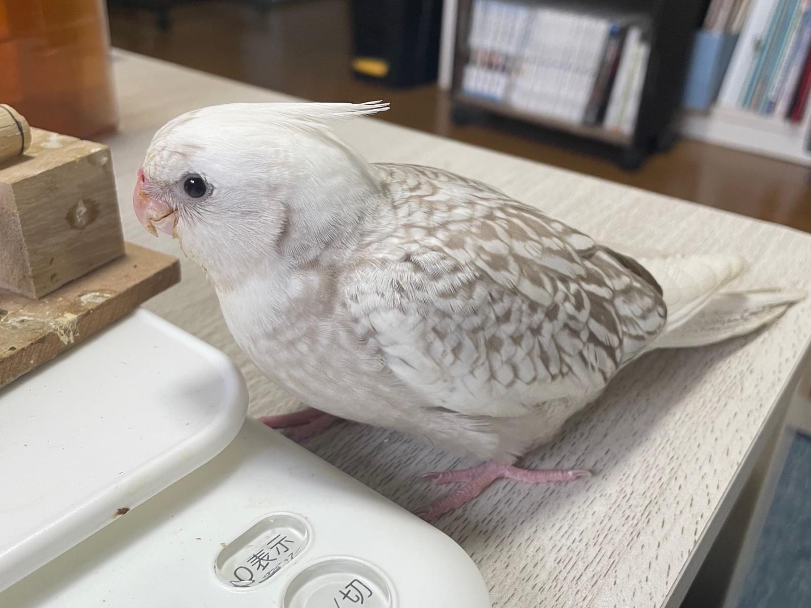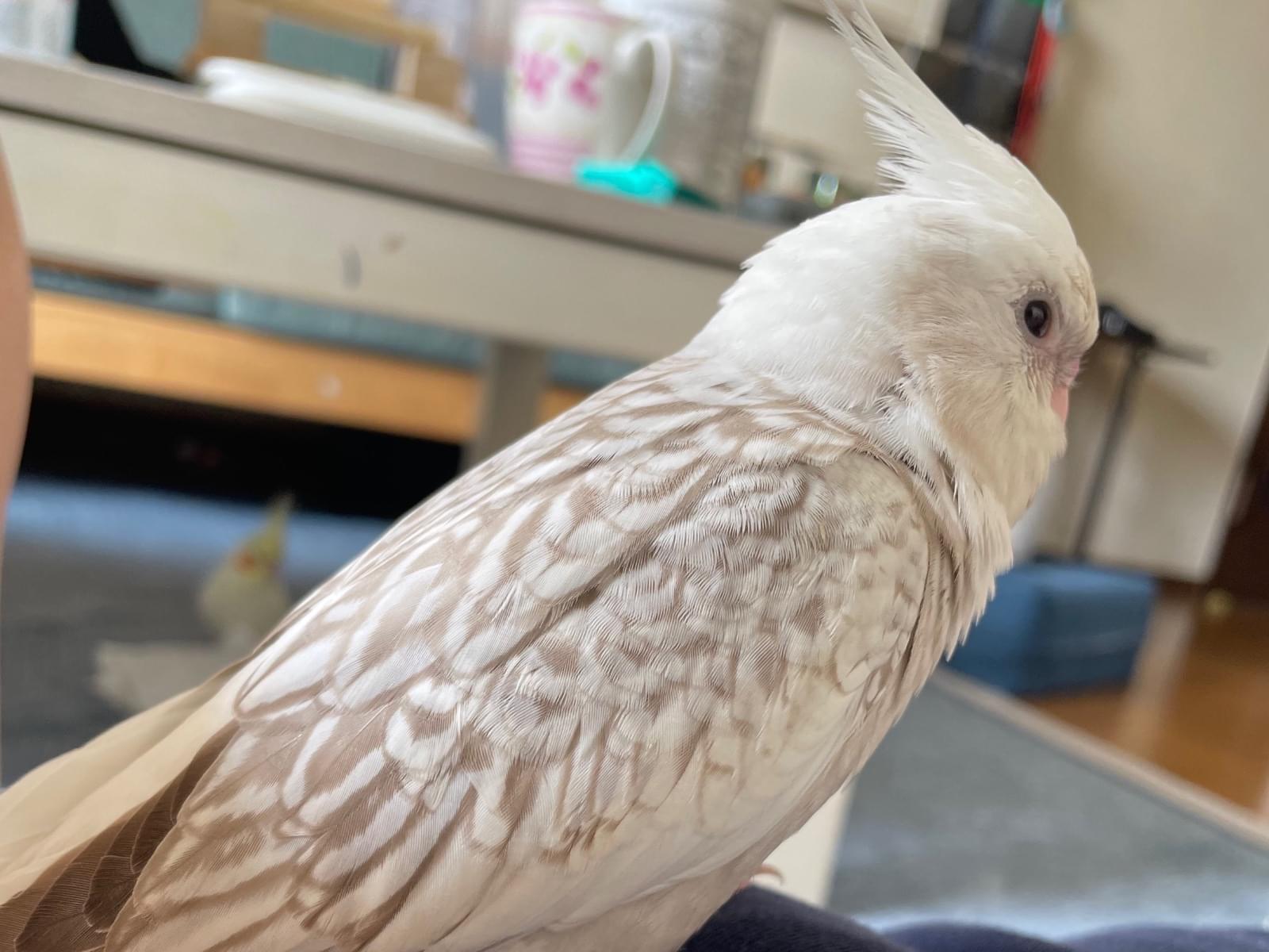 体は白にグレーっぽい、シナモンっぽい色の水玉模様があります。