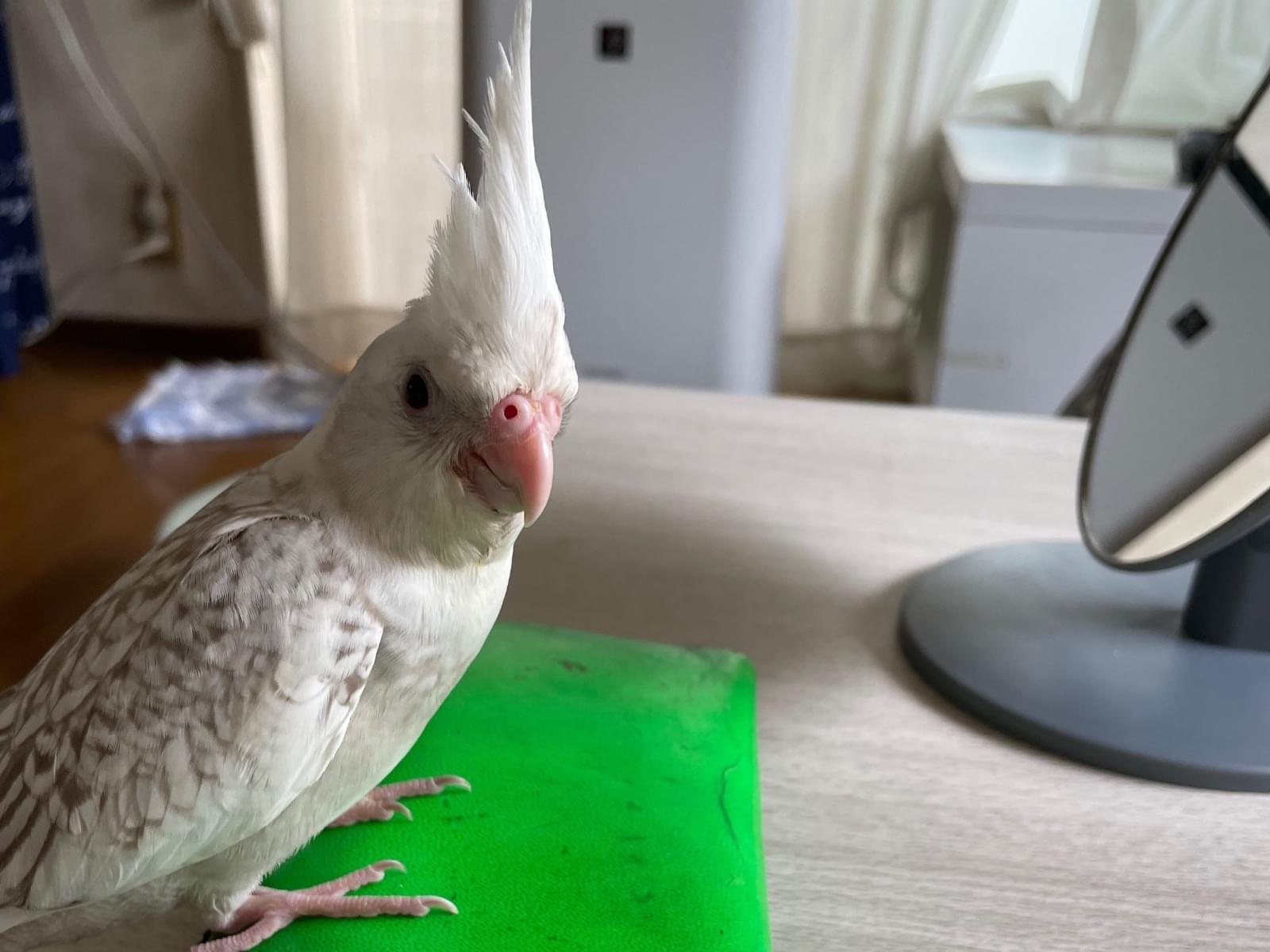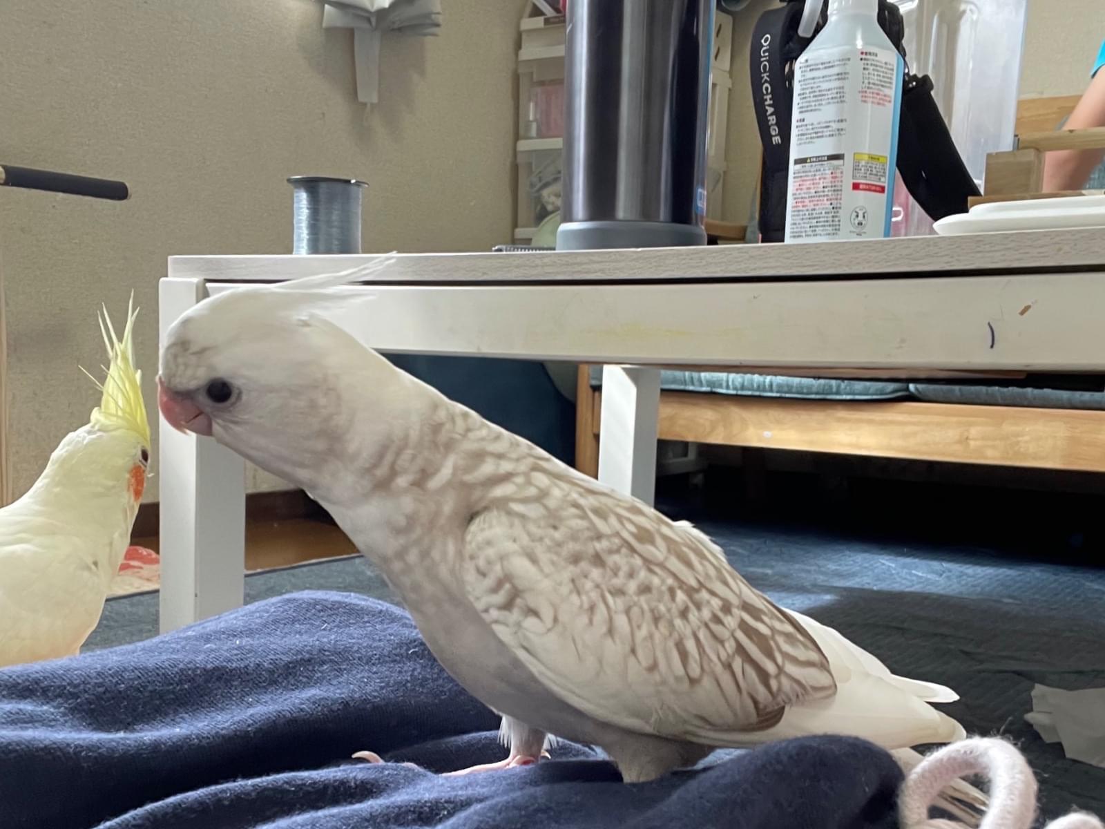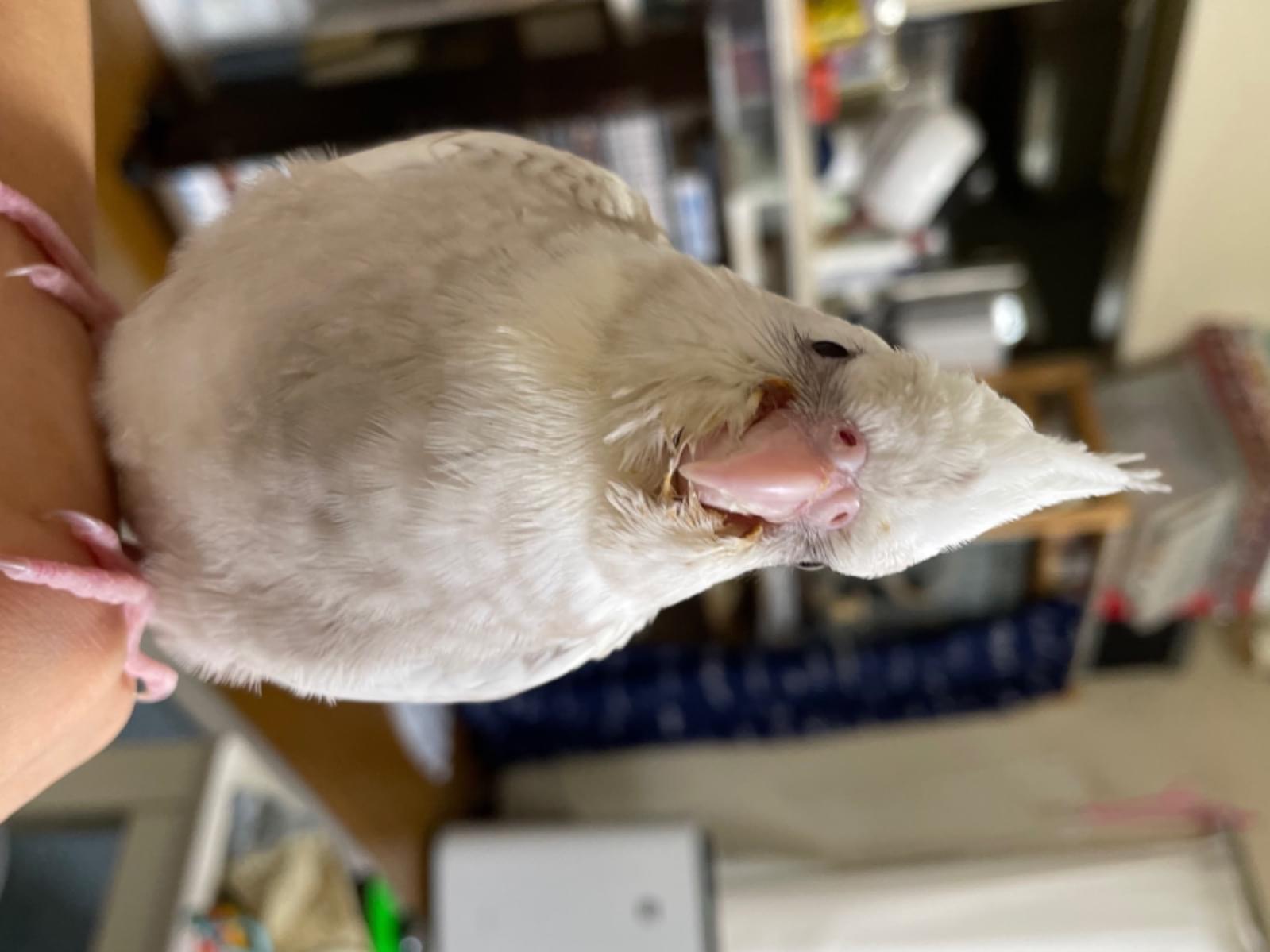 体は白にグレーっぽい、シナモンっぽい色の水玉模様があります。