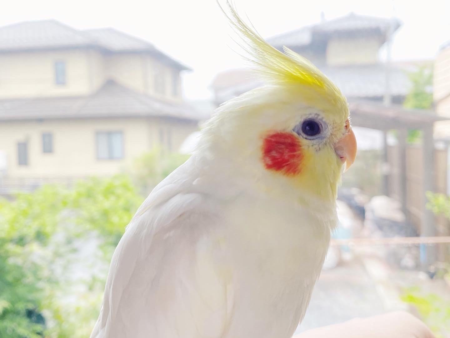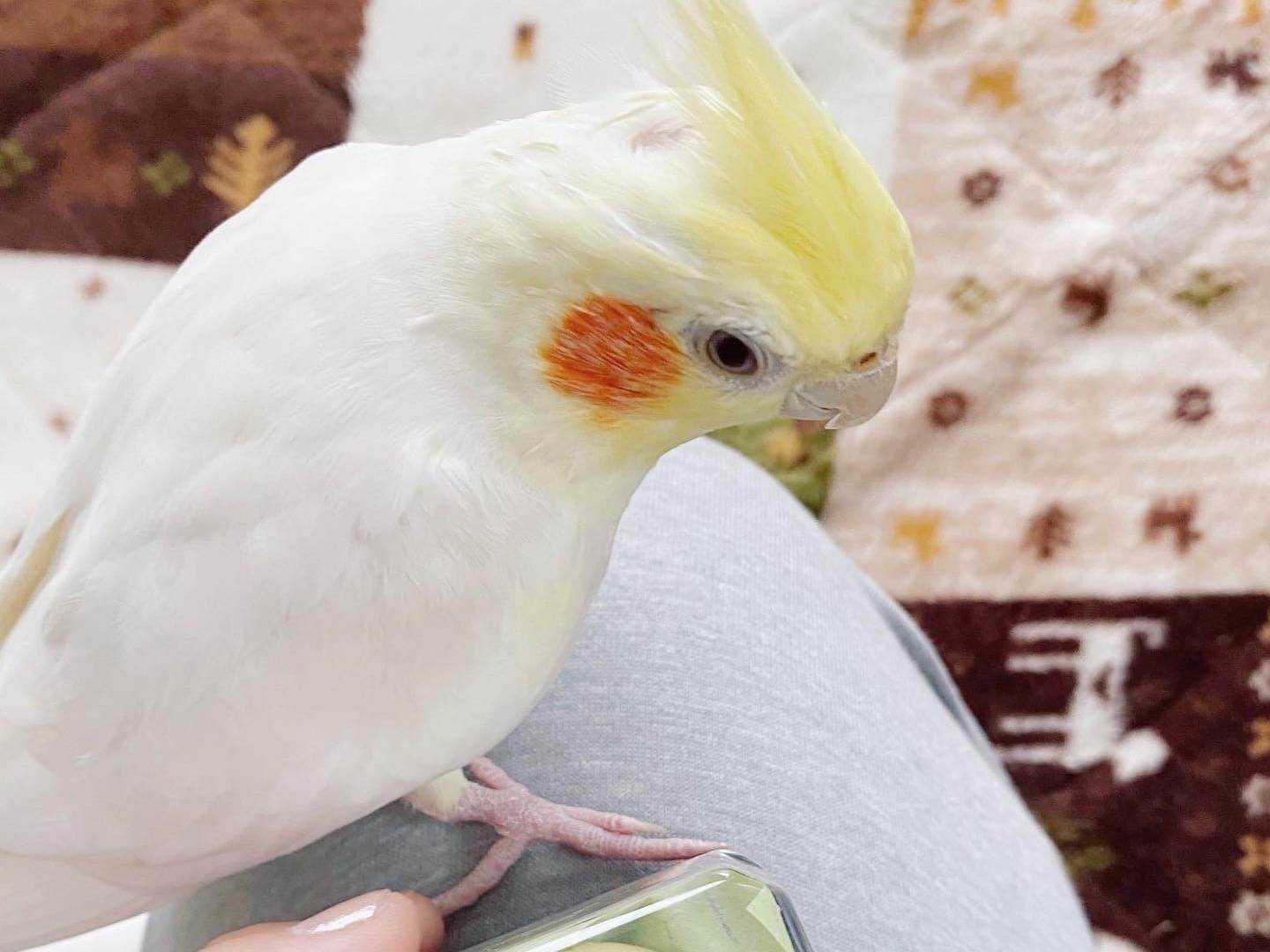 頬は赤オレンジ色、身体は白色、頭はレモン色です。オウムの仲間なので、インコと比較しても身体は少し大きめです。