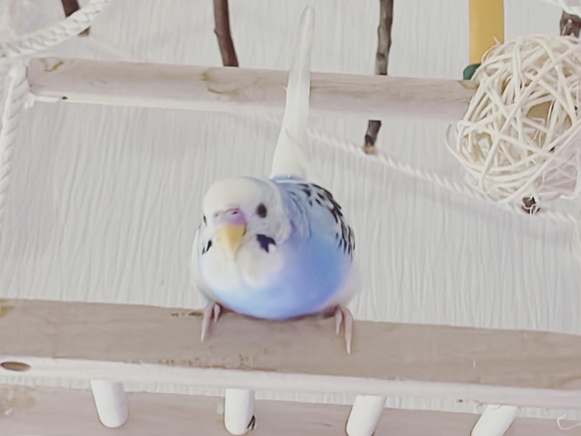 セキセイインコのパイドです。水色と白色のインコでくちばしは黄色です。